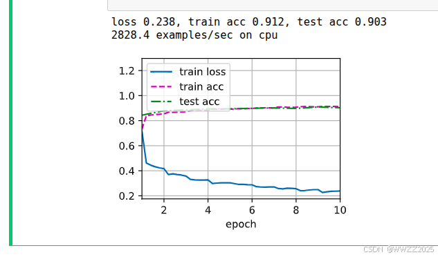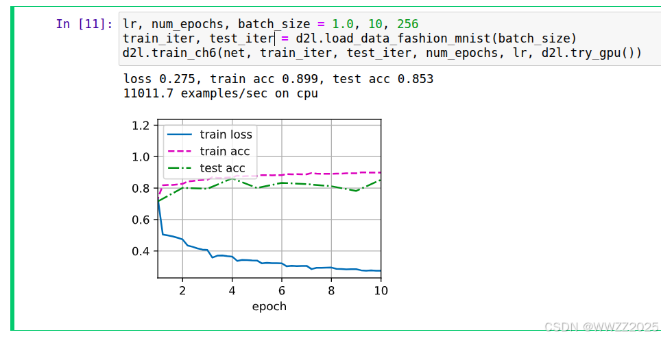 pythonlr, num_epochs, batch_size = 0.05, 10, 256 train_iter, test_iter = d2l.load_data_fashion_mnist(batch_size, resize=96) d2l.train_ch6(net, train_iter, test_iter, num_epochs, lr, d2l.try_gpu())