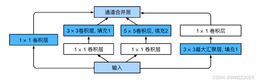 特点:和3*3或5*5卷积层相比,Inception块有更少的参数个数和计算复杂度。(通过有选择的降低通道数而减少运算量)