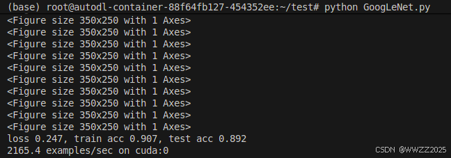 b1 = nn.Sequential(nn.Conv2d(1, 64, kernel_size=7, stride=2, padding=3), nn.ReLU(), nn.MaxPool2d(kernel_size=3, stride=2, padding=1)) b2 = nn.Sequential(nn.Conv2d(64, 64, kernel_size=1), nn.ReLU(), nn.Conv2d(64, 192, kernel_size=3, padding=1), nn.ReLU(), nn.MaxPool2d(kernel_size=3, stride=2, padding=1)) b3 = nn.Sequential(Inception(192, 64, (96, 128), (16, 32), 32), Inception(256, 128, (128, 192), (32, 96), 64), nn.MaxPool2d(kernel_size=3, stride=2, padding=1)) b4 = nn.Sequential(Inception(480, 192, (96, 208), (16, 48), 64), Inception(512, 160, (112, 224), (24, 64), 64), Inception(512, 128, (128, 256), (24, 64), 64), Inception(512, 112, (144, 288), (32, 64), 64), Inception(528, 256, (160, 320), (32, 128), 128), nn.MaxPool2d(kernel_size=3, stride=2, padding=1)) b5 = nn.Sequential(Inception(832, 256, (160, 320), (32, 128), 128), Inception(832, 384, (192, 384), (48, 128), 128), nn.AdaptiveAvgPool2d((1,1)), nn.Flatten()) net = nn.Sequential(b1, b2, b3, b4, b5, nn.Linear(1024, 10)) X = torch.rand(size=(1, 1, 96, 96)) for layer in net: X = layer(X) print(layer.__class__.__name__,'output shape:\t', X.shape)(3)模型训练