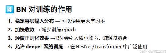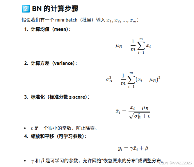 批量归一化就是对每一层的输入做标准化(减均值、除方差),再通过可学习的缩放和平移让网络自适应调整。目的是让每一层输入的分布("零均值、单位方差")更稳定,训练更快、更稳定。