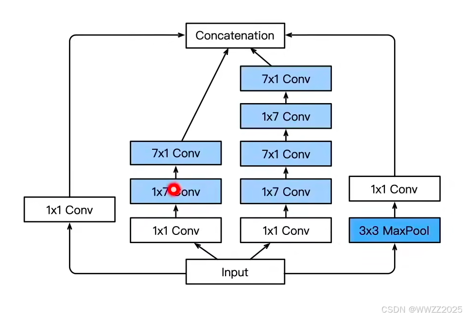 修改了Inception块,替换5x5为多个3x3卷积层、5x5为1x7和7x1卷积层、3x3为1x3和3x1卷