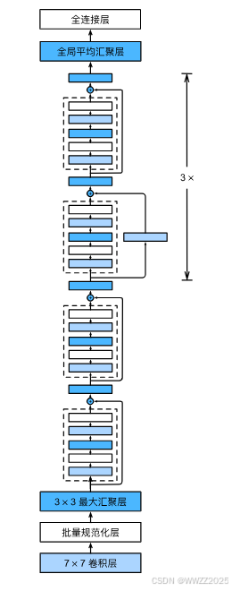 pythonblk = Residual(3,3) X = torch.rand(4, 3, 6, 6) Y = blk(X) Y.shape blk = Residual(3,6, use_1x1conv=True, strides=2) blk(X).shape(2)ResNet模型