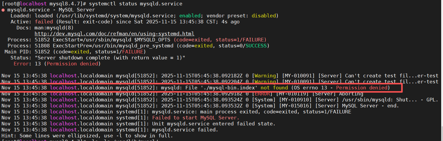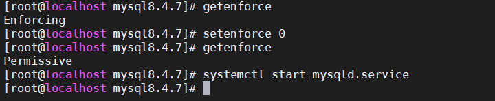 # 如果启用了SELinux,尝试临时禁用验证是否为原因 [root@localhost mysql8.4.7]# getenforce [root@localhost mysql8.4.7]# setenforce 0