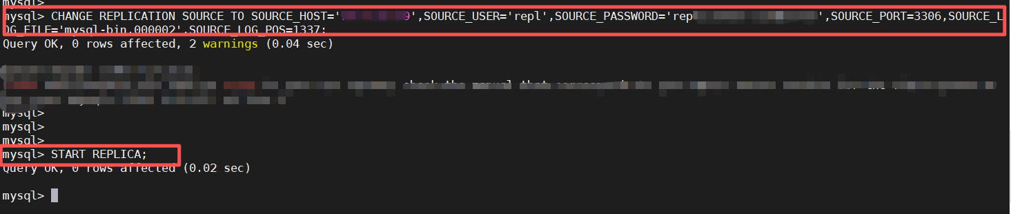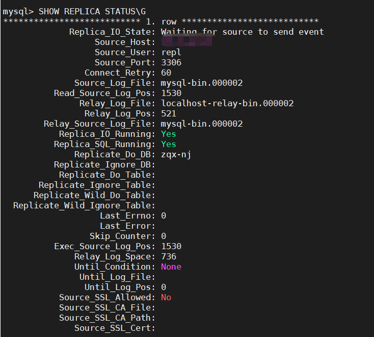 # 配置主服务器信息 mysql> CHANGE REPLICATION SOURCE TO SOURCE_HOST='xx.xx.xx.xx',SOURCE_USER='repl',SOURCE_PASSWORD='replication',SOURCE_PORT=3306,SOURCE_LOG_FILE='mysql-bin.000002',SOURCE_LOG_POS=1337; # 参数说明: SOURCE_HOST: 主服务器IP地址 SOURCE_USER: 复制用户名称 SOURCE_PASSWORD: 复制用户密码 SOURCE_PORT: 主服务器端口号 SOURCE_LOG_FILE: 二进制日志文件名,在主库中查看到的File SOURCE_LOG_POS: 二进制日志位,在主库中查看到的Position # 启动复制 mysql> START REPLICA; # 其它备用命令 STOP REPLICA; -- 停止备份 SHOW REPLICA STATUS; -- 查看备份状态