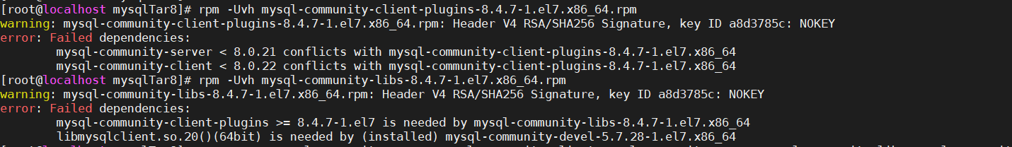 # 执行以下命令卸载后就可以正常安装了 [root@localhost mysqlTar8]# yum remove mysql-community-server mysql-community-client mysql-community-common mysql-community-libs mysql-community-devel [root@localhost mysqlTar8]# yum remove mariadb-libs -