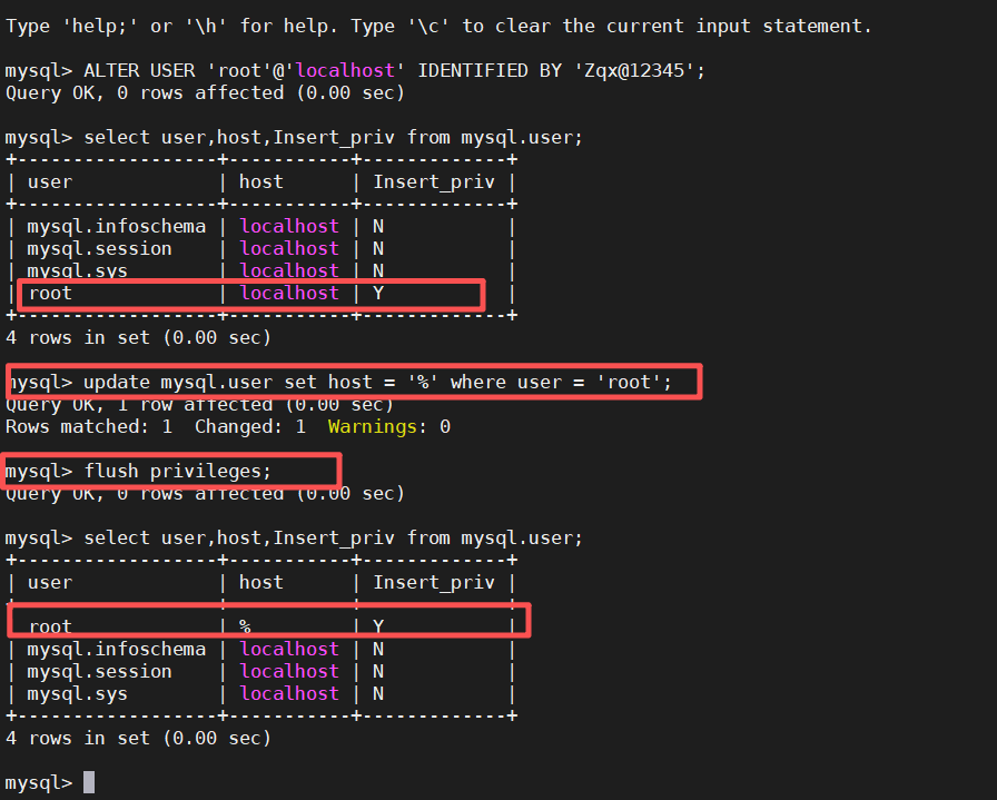 mysql> select user,host,Insert_priv from mysql.user; # 当host为localhost或指定ip地址,说明当前账号只能在本机或对应ip地址主机能登录成功,当 host为"%"时表示当前局域网内任意主机均支持登录。 # 设置允许远程连接: mysql> update mysql.user set host = '%' where user = 'root'; 刷新系统权限相关表: mysql> flush privileges;