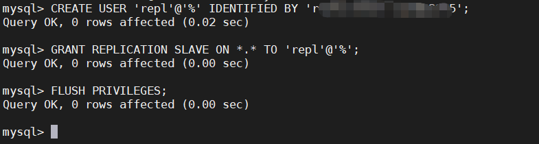 -- 创建复制用户 CREATE USER 'repl'@'%' IDENTIFIED BY 'replication_password'; -- 授予复制权限 GRANT REPLICATION SLAVE ON *.* TO 'repl'@'%'; -- 刷新权限 FLUSH PRIVILEGES;