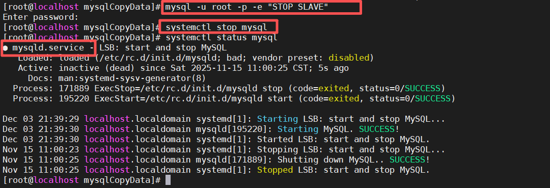 # 在从库上执行 # 停止从库(slave)的复制线程,使从库不再接收和应用来自主库(master)的 binlog 数据 [root@localhost mysqlCopyData]# mysql -u root -p -e "STOP SLAVE" # 停止服务器 systemctl stop mysql