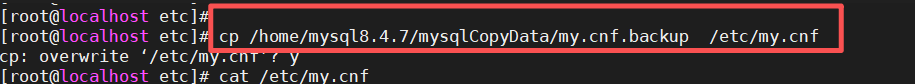 # 用之前备份的主库my.cnf.backup文件替换当前my.cnf文件 [root@localhost etc]# cp /home/mysql8.4.7/mysqlCopyData/my.cnf.backup /etc/my.cnf