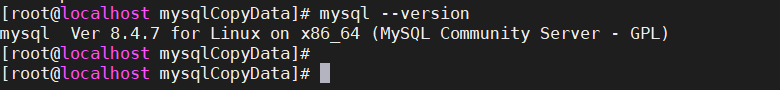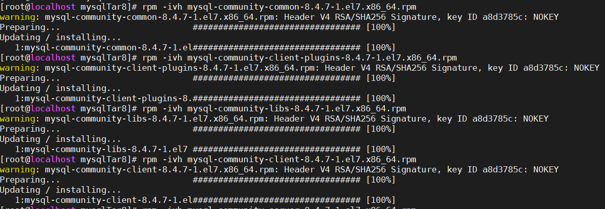 # 按以下安装顺序,否则有可能报错 [root@localhost mysqlTar8]# rpm -ivh mysql-community-common-8.4.7-1.el7.x86_64.rpm [root@localhost mysqlTar8]# rpm -ivh mysql-community-client-plugins-8.4.7-1.el7.x86_64.rpm [root@localhost mysqlTar8]# rpm -ivh mysql-community-icu-data-files-8.4.7-1.el7.x86_64.rpm [root@localhost mysqlTar8]# rpm -ivh mysql-community-libs-8.4.7-1.el7.x86_64.rpm [root@localhost mysqlTar8]# rpm -ivh mysql-community-client-8.4.7-1.el7.x86_64.rpm [root@localhost mysqlTar8]# rpm -ivh mysql-community-server-8.4.7-1.el7.x86_64.rpm