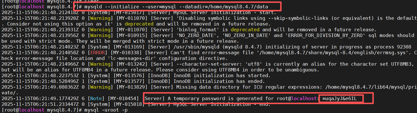 # 重新初始化, 指定目录:/home/mysql8.4.7/data mysqld --initialize --user=mysql --datadir=/home/mysql8.4.7/data 或者 # 重新初始化, 使用默认的 mysqld --initialize --user=mysql初始化会生成默认登录密码,需要记住,用户后面登录