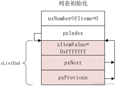 初始化列表时,将尾标记xListEnd的前后指针指向自身,形成空的双向循环链表,遍历指针pxIndex指向尾标记:```