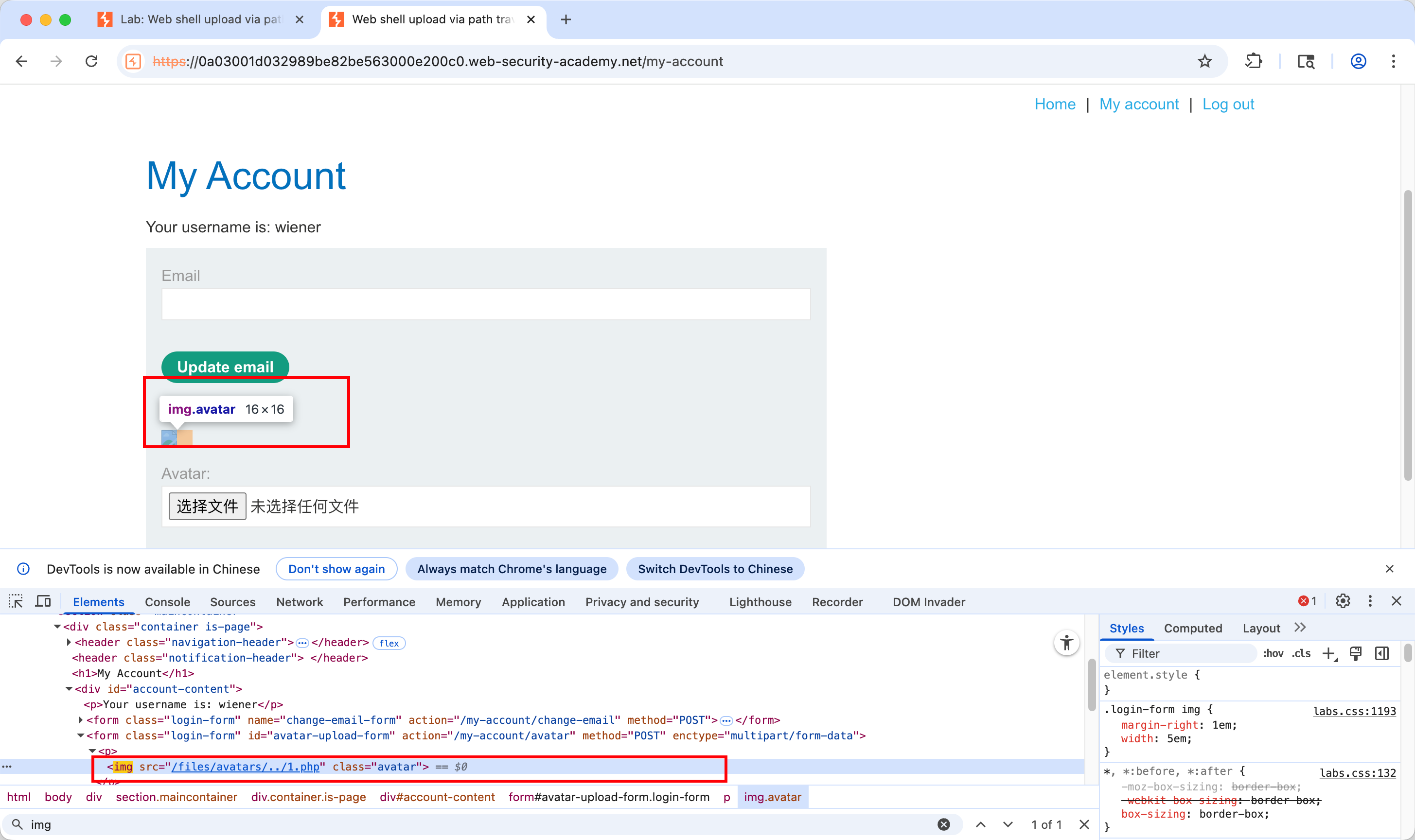 通常,为了防止攻击者上传 Web Shell(恶意脚本),服务器管理员会配置上传目录(例如 /avatars/ 目录),使其禁止执行脚本 。这意味着,即使你成功上传了一个 exploit.php 文件到头像目录,当你访问它时,服务器只会把它当作纯文本或图片显示,而不会运行里面的 PHP 代码。