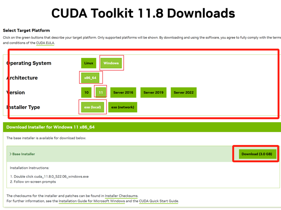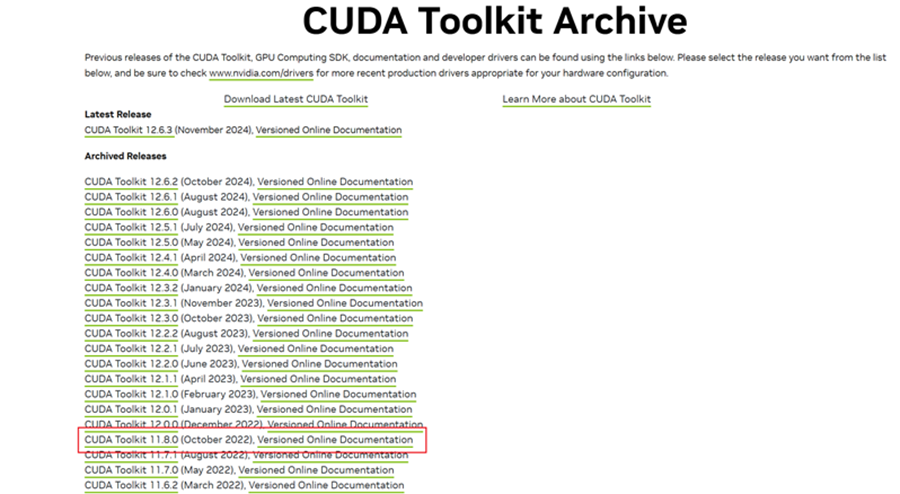 推荐下载CUDA 11.8版本,不要下载太高的版本。因为CUDA版本需要与PyTorch版本相互匹配,如果CUDA版本太高,可能无法与PyTorch匹配。