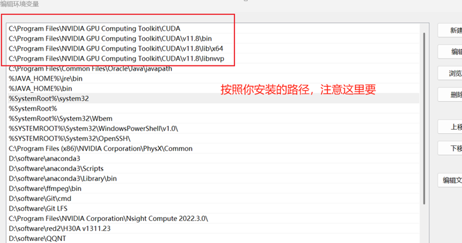 - 添加以下四条路径(假设CUDA安装在C盘):