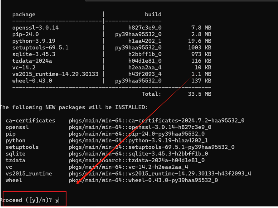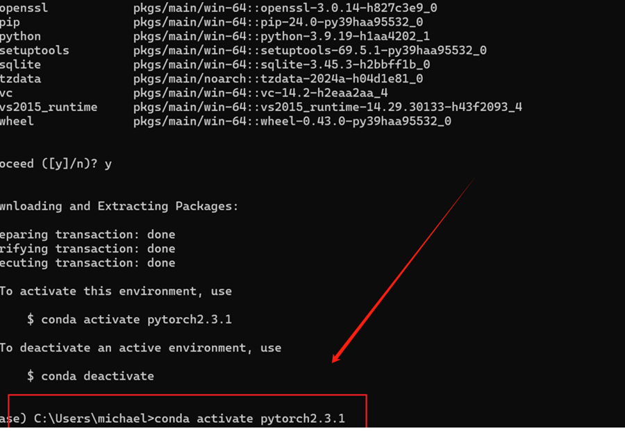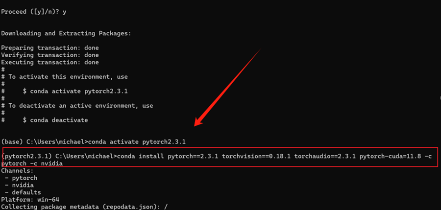 粘贴并执行PyTorch安装命令(使用之前复制的命令),等待下载和安装完成(如果下载中断,可以重新粘贴命令继续下载)