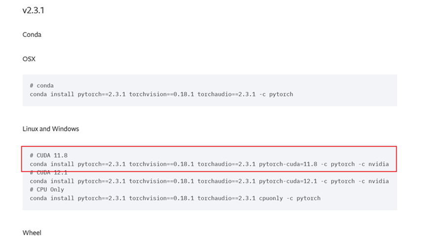 找到与CUDA 11.8匹配的PyTorch版本,如PyTorch 2.3.1