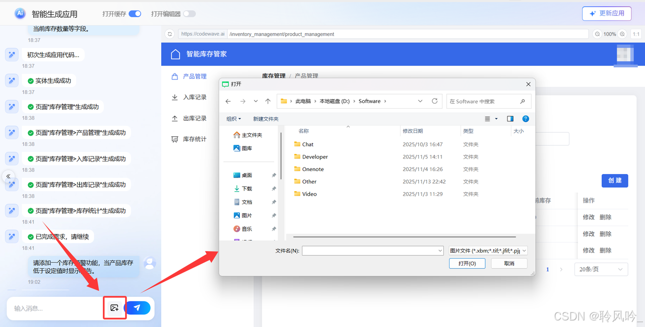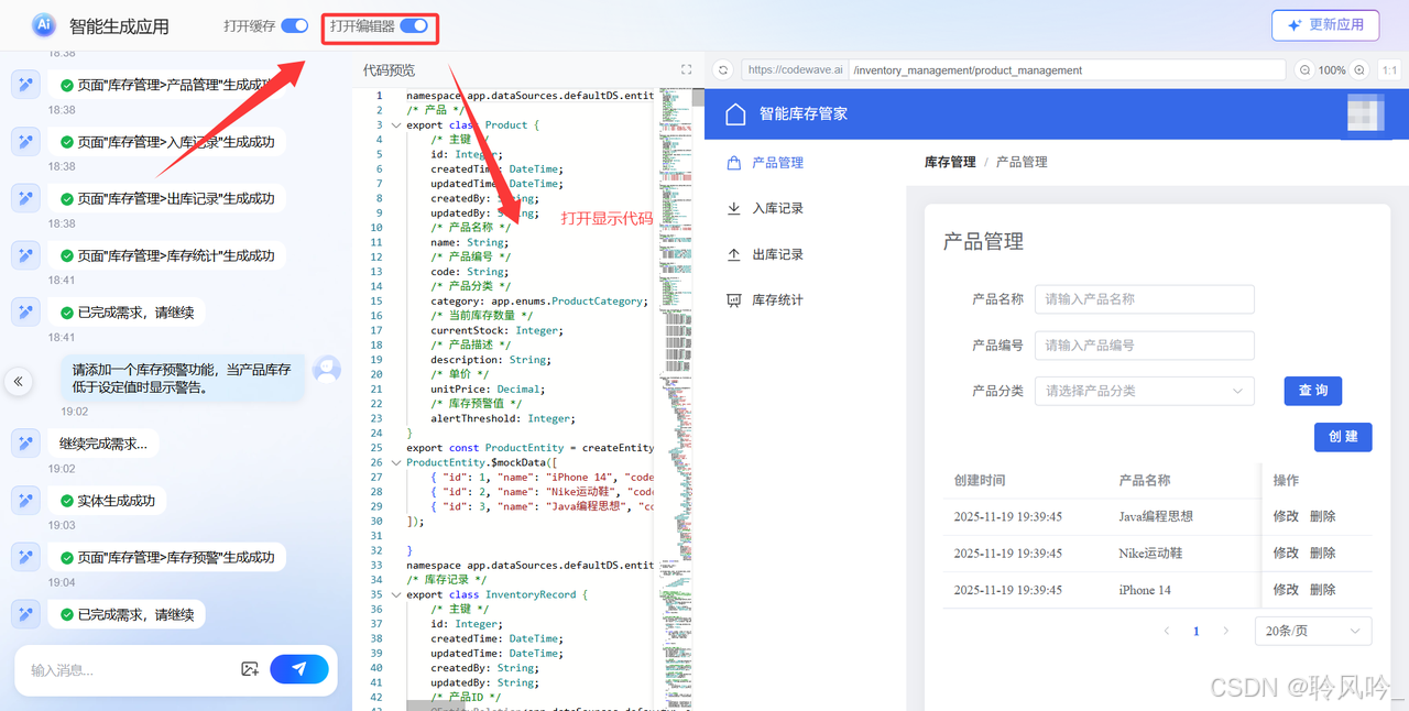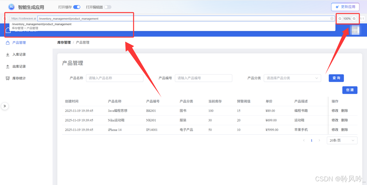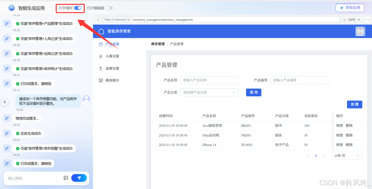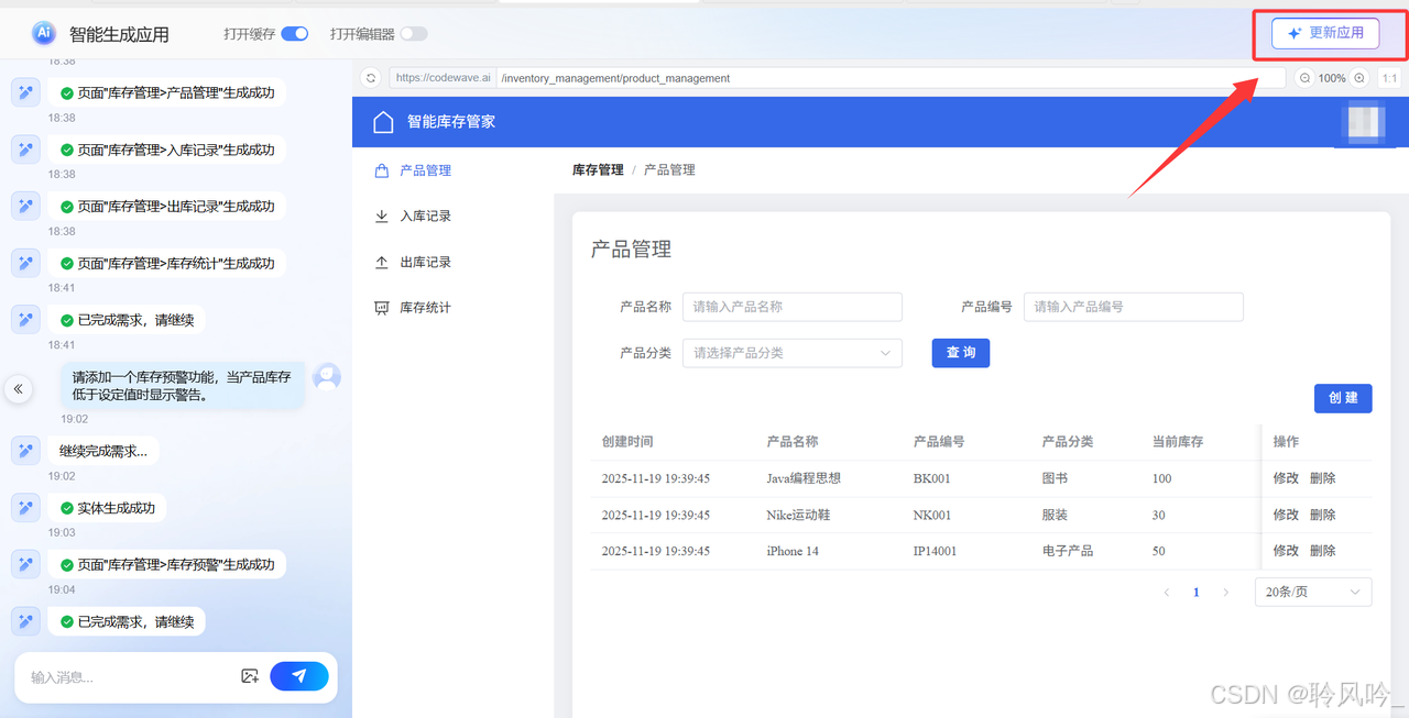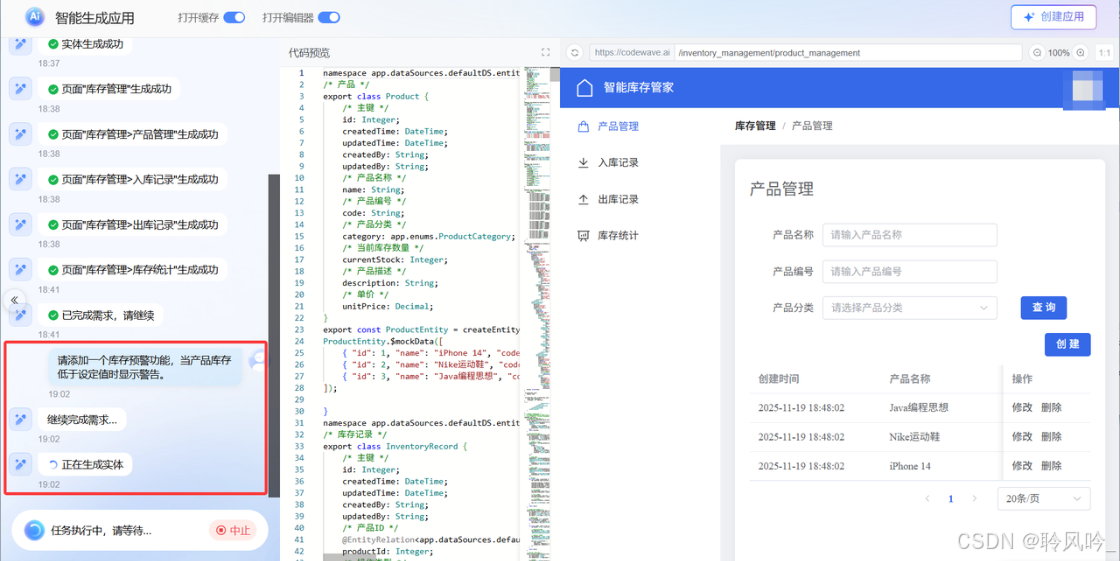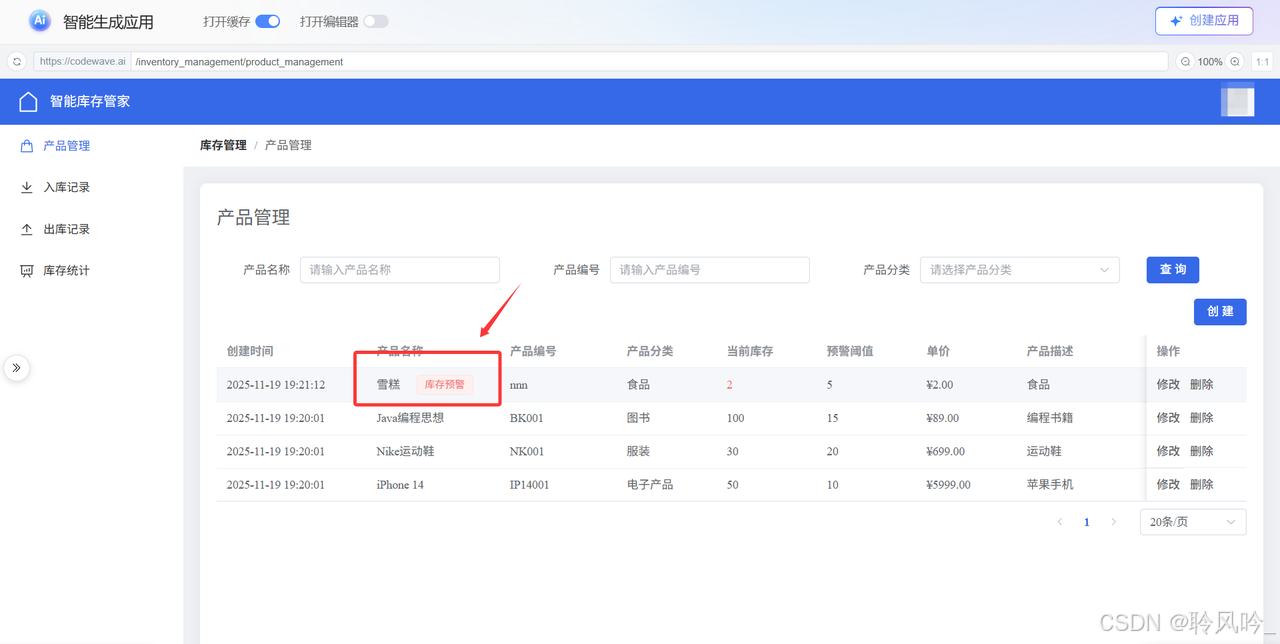 生成初版应用后,我发现需要增加一个 "库存预警" 功能。于是我在聊天界面中输入:"请添加一个库存预警功能,当产品库存低于设定值时显示警告。"
