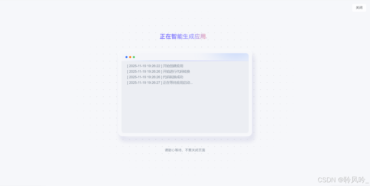 当我满意生成结果后,只需点击右上角的 "创建应用" 按钮,系统便会进入加载界面,系统会在此阶段进行代码转换、应用启动、代码传送等操作,我们只需安心等待即可。