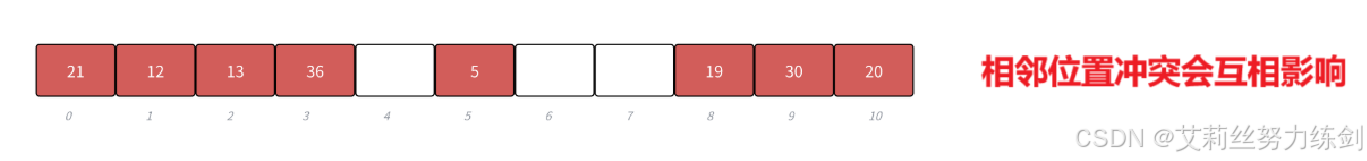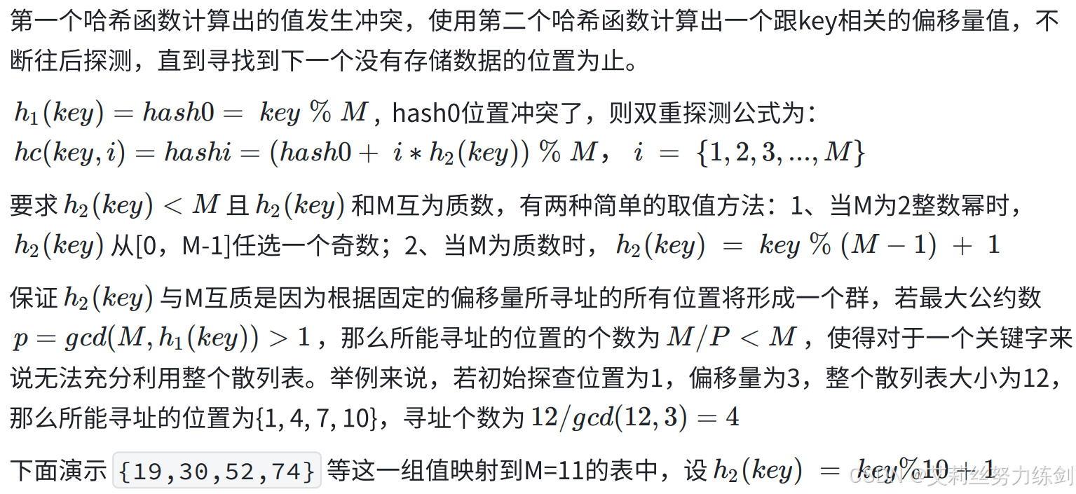 2、当使用除法散列法时,要尽量避免M为某些值,如2的幂,10的幂等。如果是2^X,key % 2^X本质相当于保留key的后X位(后X位相同的值),计算出的哈希值都是一样的------就冲突了。比如:[63,31}看起来没有关联的值,如果M是16,也就是2^4,那么计算出的哈希值都是15,因为63的二进制后8位是00111111,31的二进制后8位是00011111。如果是10^x,就更明显了,保留的都是10进值的后X位,如:[112,12312},如果M是100(10^2),计算出的哈希值都是12。