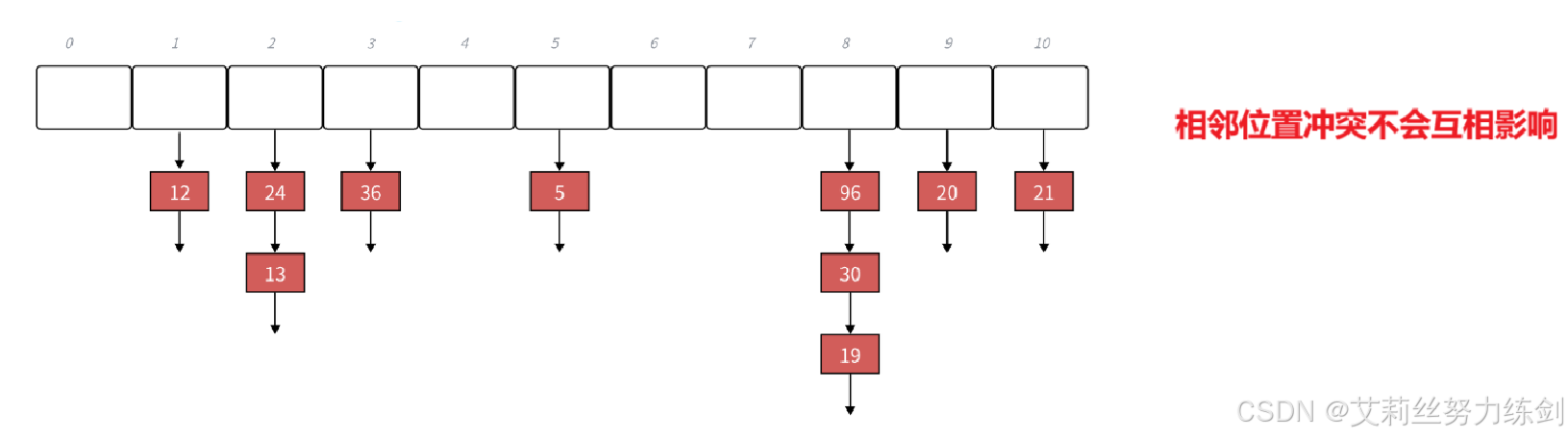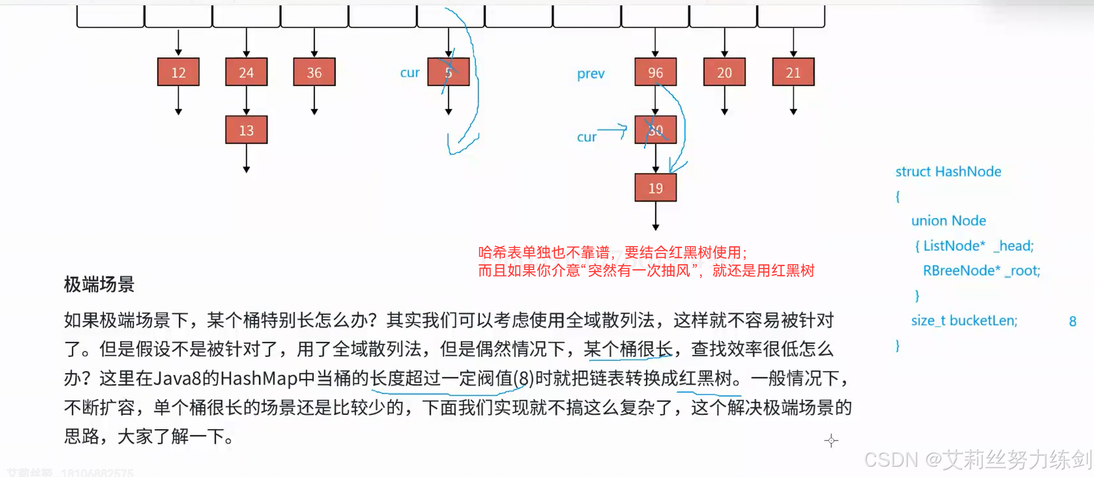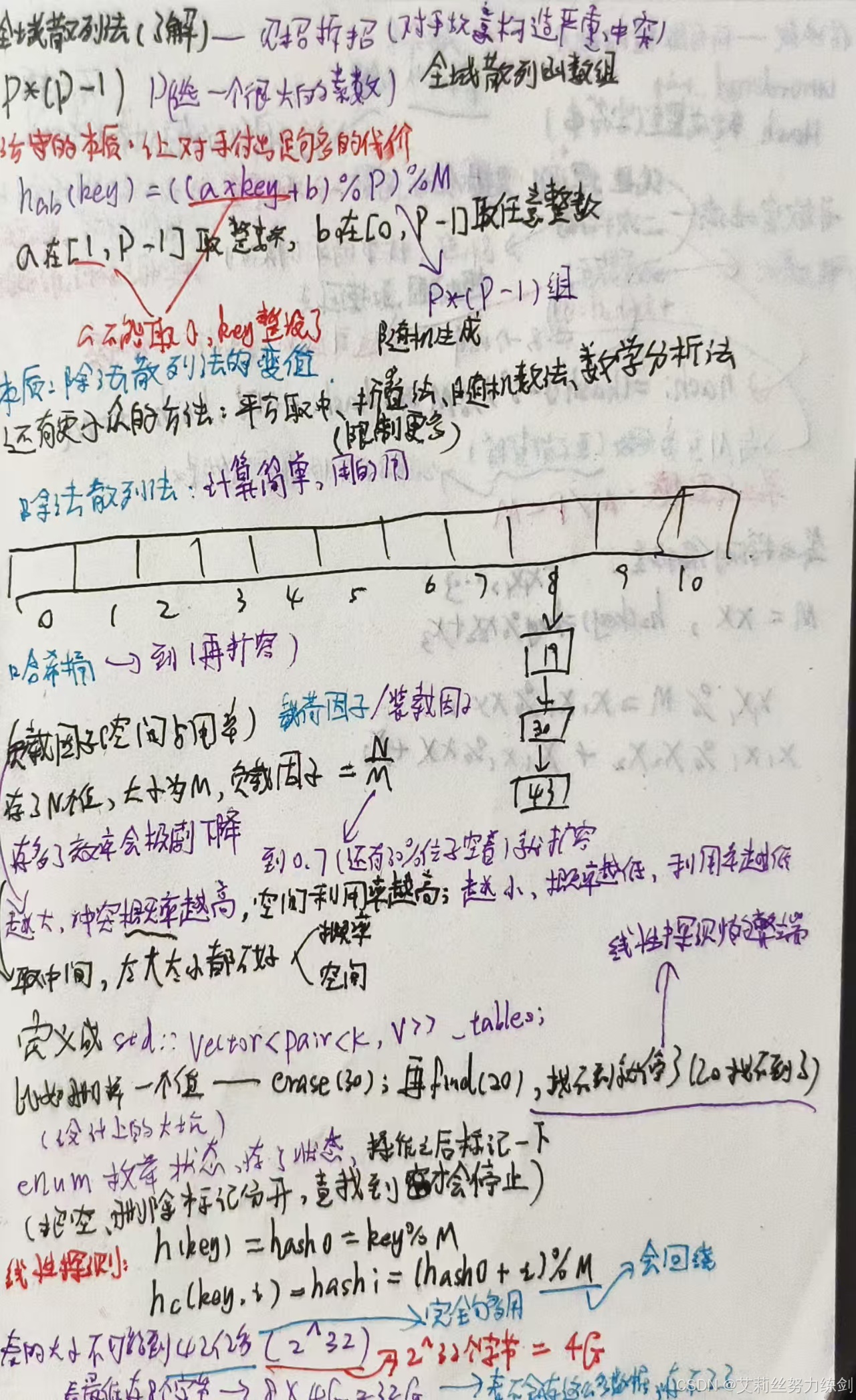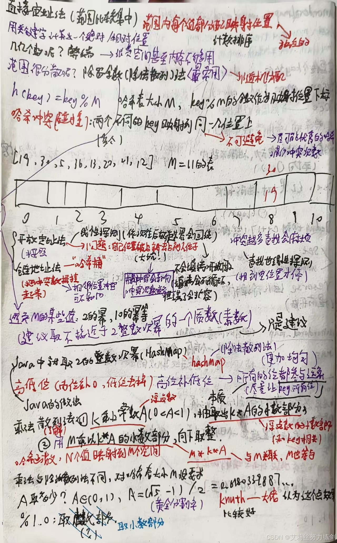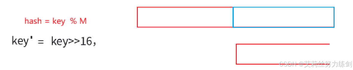 下面的内容仅做了解,大家可以选择跳过哦!前面第三点建议M取一个不太接近2的整数次幂的质数,Java中,HashMap采用除法散列法时就是2的整数次幂做哈希表的M,这样一来我们可以直接位运算,相对取模会更加高效些。只是Java不是单纯地取模,比如说M是2^16,本质上是取后16位,那么用key' = key >> 16,然后把key和key'异或的结果作为哈希值,也就是说:我们可以映射的值在[0 , M]范围内,尽可能让key所有的位都参与计算,这样映射出的哈希值更加均匀一些,因此,艾莉丝前面建议"M取不大接近2的整数次幂的一个质数",大多数数据结构书籍中写的基本是这个理论,我们实践中还是建议灵活运用。