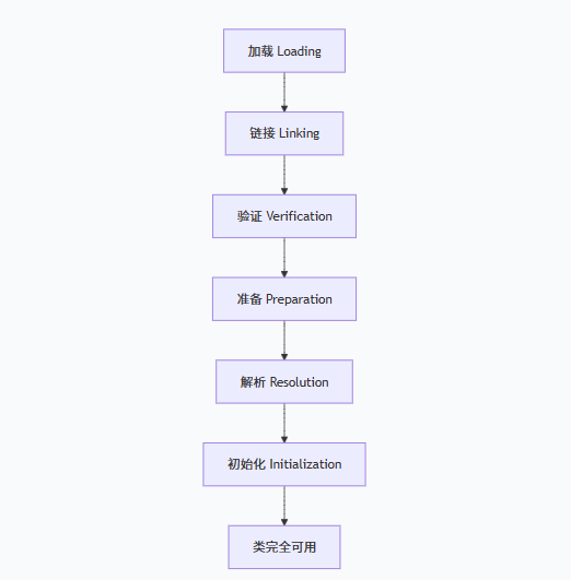 类加载的过程 主要分为以下三个核心阶段:加载、链接、初始化 。其中链接又细分为三个子阶段。