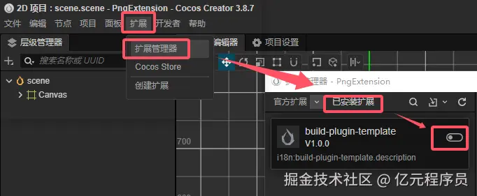 通过 菜单扩展->扩展管理器打开扩展管理器,在已安装扩展中找到我们新建的插件,将其改成开启状态。