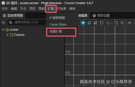 新建 一个项目,通过菜单扩展->创建扩展打开扩展创建面板。