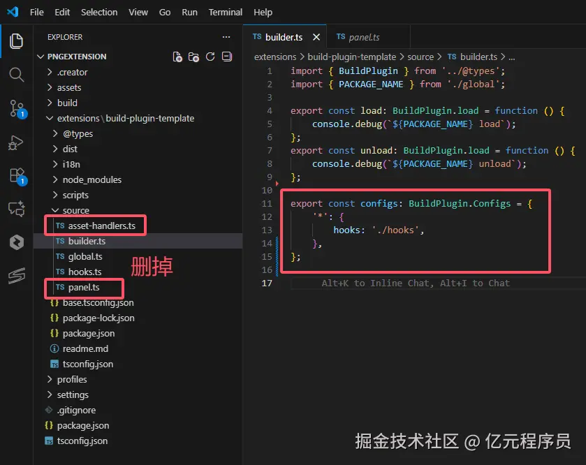 首先 我们删掉我们不需要的asset-handlers.ts和panel.ts·,在builder.ts中只保留hooks配置。