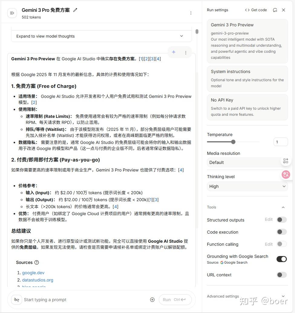 在 Google AI Studio 中使用 Gemini 3 Pro Review 目前提供了免费的选项,但有一些特定的限制和条件,详情见官网文档: