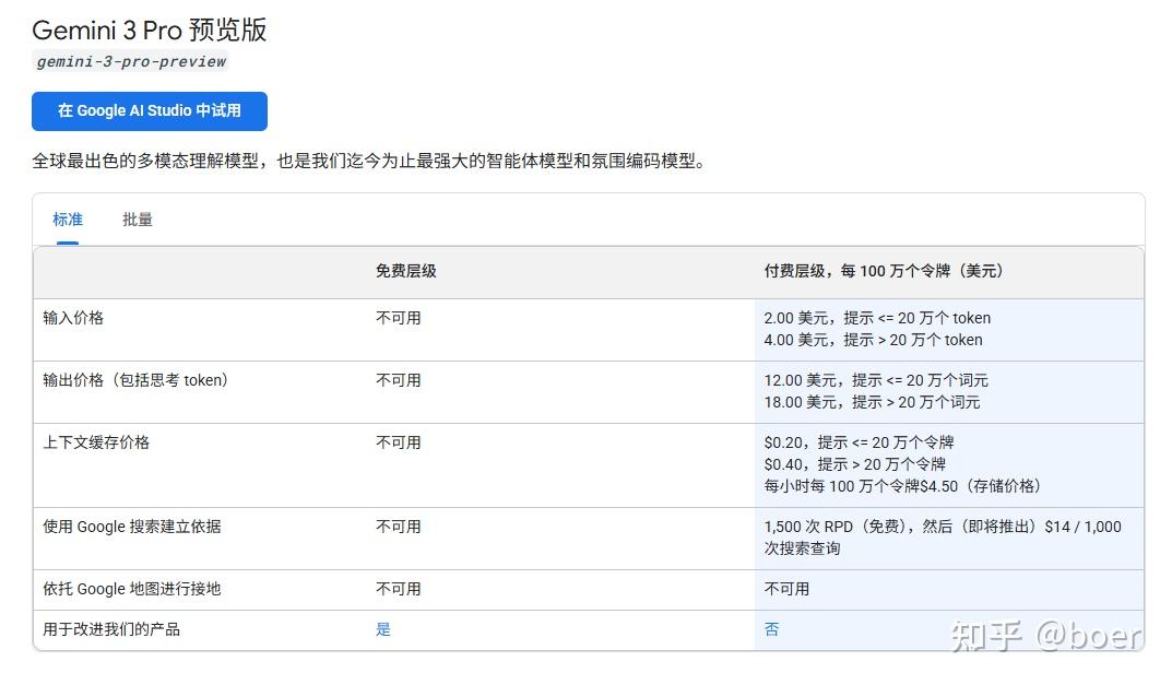 - 速率限制:免费计划对调用速率有较高限制,难以用于高频测试或生产环境,网页对话没触过上限,Gemini 3 Pro Review 具体的速率限制似乎还未公布。