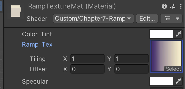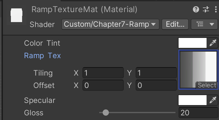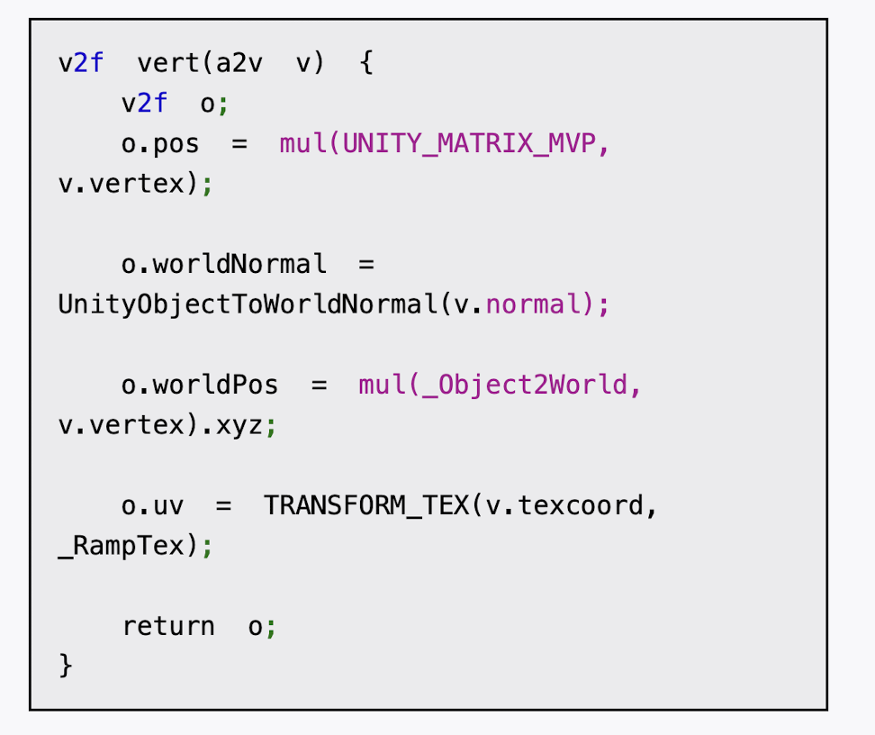 o.uv = TRANSFORM_TEX(v.texcoord, _RampTex); //TRANSFORM_TEX宏来计算经过平铺和偏移后的纹理坐标。