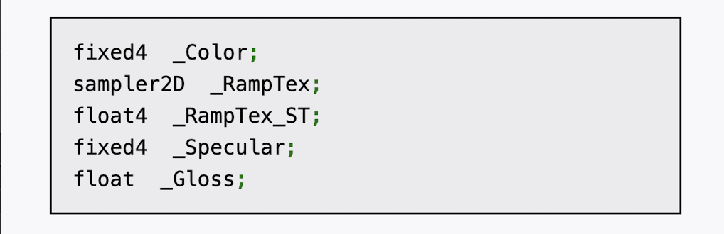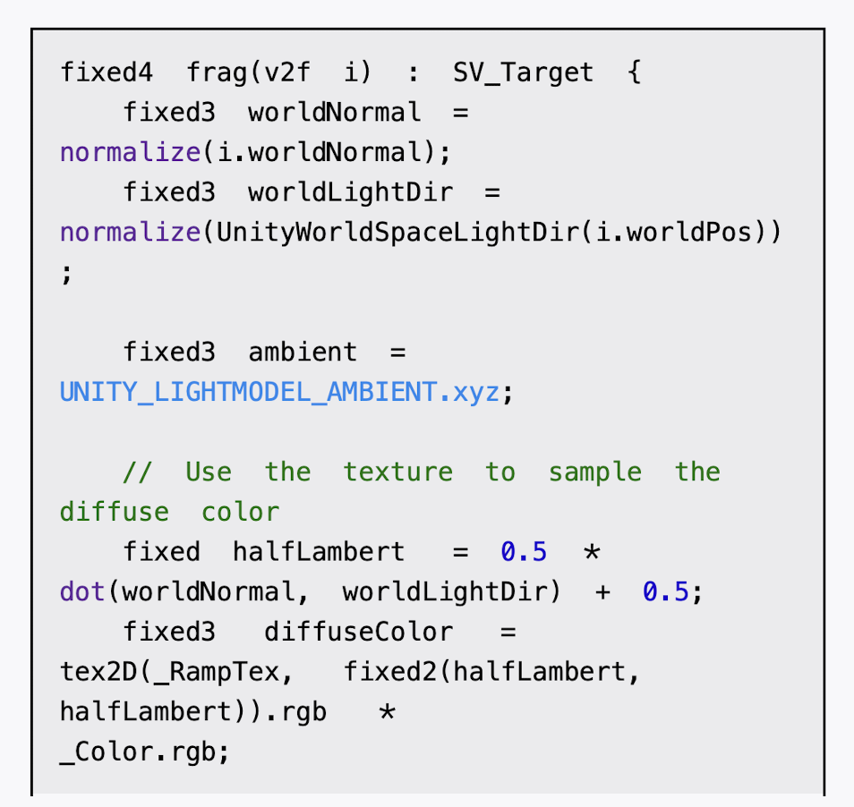 fixed3 diffuseColor = tex2D(_RampTex, fixed2(halfLambert, halfLambert)).rgb * _Color.rgb; //使用halfLambert来构建一个纹理坐标,并用这个纹理坐标对渐变纹理_RampTex进行采样