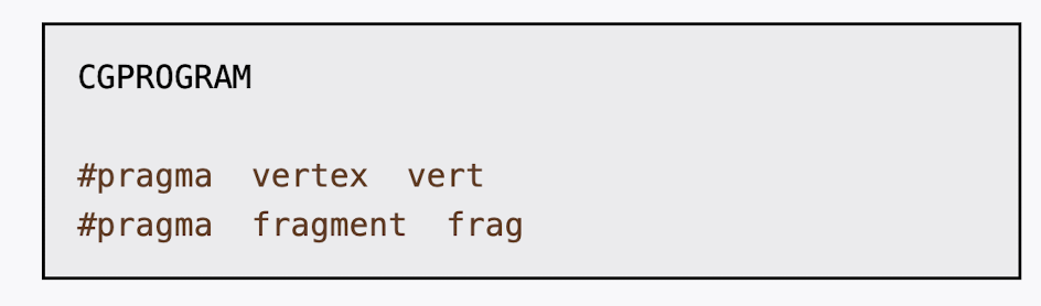 (4)然后,我们使用CGPROGRAM和ENDCG来包围住CG代码片,以定义最重要的顶点着色器和片元着色器代码。我们使用#pragma指令来告诉Unity,我们定义的顶点着色器和片元着色器叫什么名字。在本例中,它们的名字分别是vert和frag: