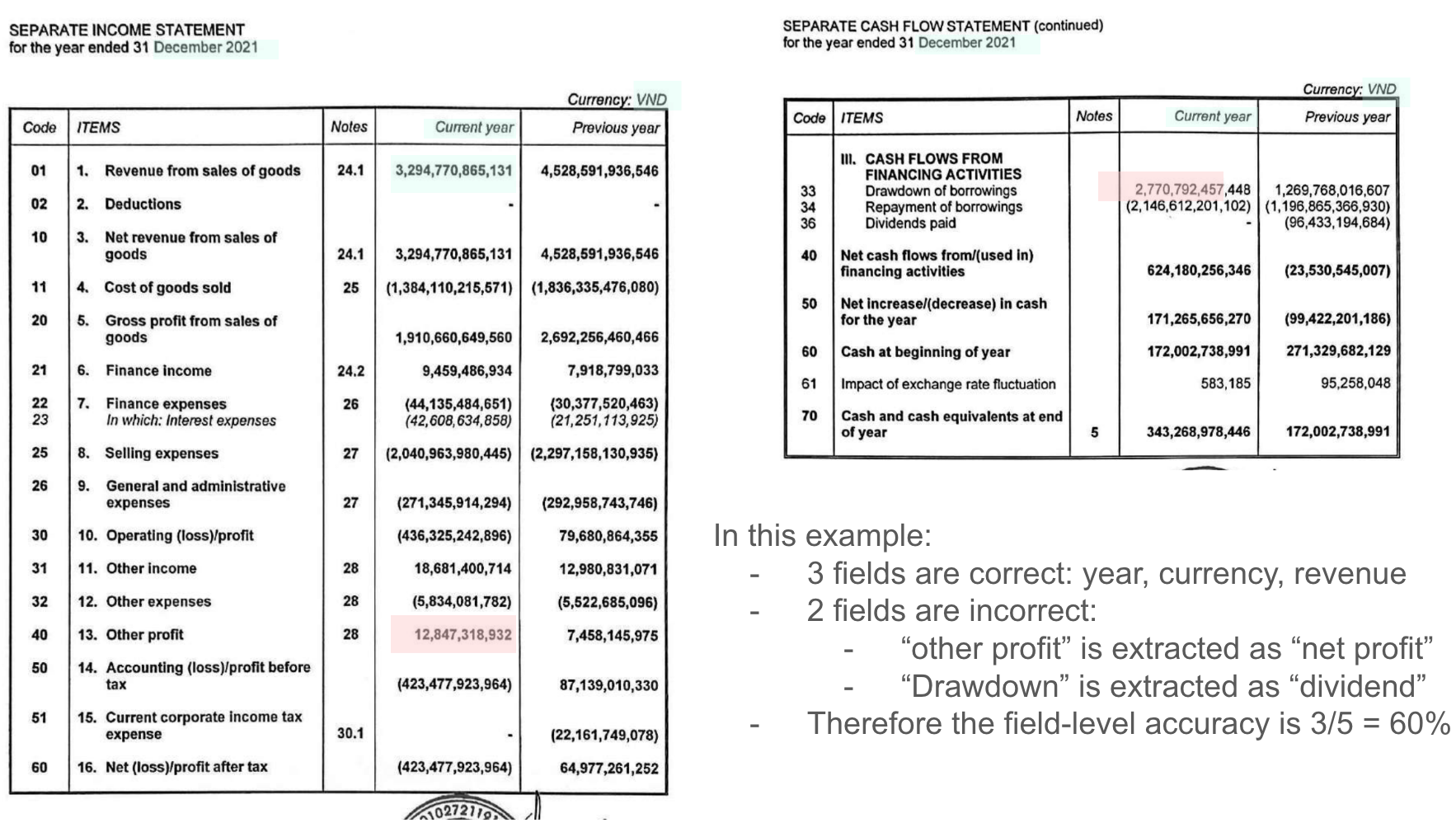 这是最核心的评估指标,衡量关键财务字段(特别是五个字段:年份、收入、利润、股息和货币单位)是否与人工标注的真实值正确提取匹配。