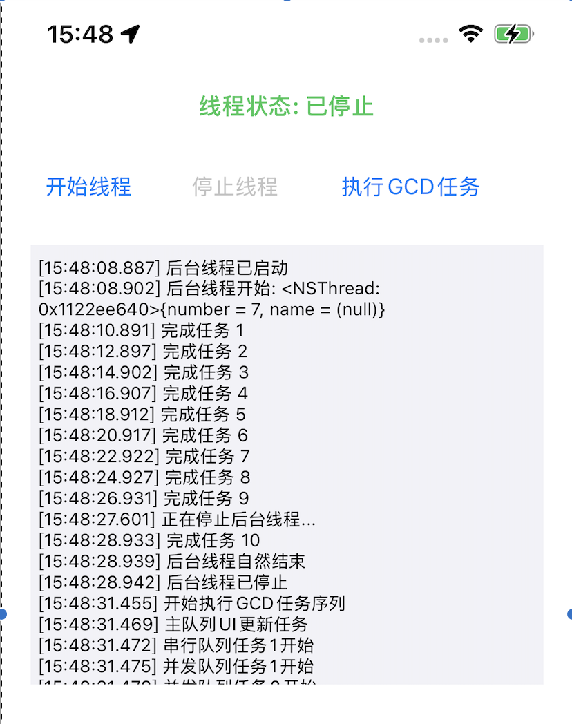 self.window makeKeyAndVisible\]; return YES; } 功能:应用程序启动入口点,负责初始化主窗口和根视图控制器。 2. CustomViewController 类 `viewDidLoad` 方法 objective-c - (void)viewDidLoad { \[super viewDidLoad\]; \[self setupUI\]; // 初始化用户界面组件 \[self setupQueues\]; // 创建GCD队列 self.logContent = \[NSMutableString string\]; // 初始化日志内容存储 } 功能:视图控制器加载完成后的初始化工作。 `setupUI` 方法 objective-c - (void)setupUI { // 设置视图背景色 self.view.backgroundColor = \[UIColor systemBackgroundColor\]; // 创建状态标签 - 显示线程运行状态 self.statusLabel = \[\[UILabel alloc\] initWithFrame:CGRectMake(20, 60, self.view.bounds.size.width - 40, 30)\]; self.statusLabel.text = @"线程状态: 就绪"; self.statusLabel.textAlignment = NSTextAlignmentCenter; self.statusLabel.font = \[UIFont boldSystemFontOfSize:16\]; // 创建开始按钮 - 启动后台线程 self.startButton = \[UIButton buttonWithType:UIButtonTypeSystem\]; self.startButton.frame = CGRectMake(20, 110, 80, 40); \[self.startButton setTitle:@"开始线程" forState:UIControlStateNormal\]; \[self.startButton addTarget:self action:@selector(startBackgroundThread) forControlEvents:UIControlEventTouchUpInside\]; // 创建停止按钮 - 停止后台线程(初始禁用) self.stopButton = \[UIButton buttonWithType:UIButtonTypeSystem\]; self.stopButton.frame = CGRectMake(120, 110, 80, 40); \[self.stopButton setTitle:@"停止线程" forState:UIControlStateNormal\]; \[self.stopButton addTarget:self action:@selector(stopBackgroundThread) forControlEvents:UIControlEventTouchUpInside\]; self.stopButton.enabled = NO; // 创建GCD任务按钮 - 执行GCD演示任务 self.dispatchButton = \[UIButton buttonWithType:UIButtonTypeSystem\]; self.dispatchButton.frame = CGRectMake(220, 110, 120, 40); \[self.dispatchButton setTitle:@"执行GCD任务" forState:UIControlStateNormal\]; \[self.dispatchButton addTarget:self action:@selector(performGCDTasks) forControlEvents:UIControlEventTouchUpInside\]; // 创建活动指示器 - 显示线程运行状态 self.activityIndicator = \[\[UIActivityIndicatorView alloc\] initWithActivityIndicatorStyle:UIActivityIndicatorViewStyleMedium\]; self.activityIndicator.frame = CGRectMake(self.view.bounds.size.width - 60, 115, 30, 30); // 创建日志文本框 - 显示线程执行日志 self.logTextView = \[\[UITextView alloc\] initWithFrame:CGRectMake(20, 170, self.view.bounds.size.width - 40, 300)\]; self.logTextView.editable = NO; self.logTextView.font = \[UIFont systemFontOfSize:12\]; self.logTextView.backgroundColor = \[UIColor secondarySystemBackgroundColor\]; self.logTextView.text = @"线程日志:\\n"; } 功能:创建和配置所有UI组件,包括标签、按钮、活动指示器和日志显示区域。 `setupQueues` 方法 objective-c - (void)setupQueues { // 创建串行队列 - 任务按顺序执行 self.serialQueue = dispatch_queue_create("com.example.serialQueue", DISPATCH_QUEUE_SERIAL); // 创建并发队列 - 任务可以并行执行 self.concurrentQueue = dispatch_queue_create("com.example.concurrentQueue", DISPATCH_QUEUE_CONCURRENT); } 功能:初始化GCD队列,为后续的多线程任务做准备。 3. 线程控制核心方法 `startBackgroundThread` 方法 objective-c - (void)startBackgroundThread { // 检查线程是否已在运行 if (self.backgroundThread \&\& !self.backgroundThread.isFinished) { \[self updateLog:@"后台线程已在运行"\]; return; } // 设置线程运行标志 self.shouldKeepRunning = YES; // 创建并启动新线程,执行backgroundThreadMain方法 self.backgroundThread = \[\[NSThread alloc\] initWithTarget:self selector:@selector(backgroundThreadMain) object:nil\]; \[self.backgroundThread start\]; // 更新UI状态 self.startButton.enabled = NO; self.stopButton.enabled = YES; \[self.activityIndicator startAnimating\]; \[self updateLog:@"后台线程已启动"\]; self.statusLabel.text = @"线程状态: 运行中"; } 功能:启动新的后台线程,更新UI状态,设置线程运行标志。 `backgroundThreadMain` 方法 objective-c - (void)backgroundThreadMain { @autoreleasepool { // 创建自动释放池,管理内存 // 获取当前线程信息并记录日志 NSThread \*currentThread = \[NSThread currentThread\]; \[self updateLog:\[NSString stringWithFormat:@"后台线程开始: %@", currentThread\]\]; int taskCount = 0; // 主循环:检查运行标志并执行任务 while (self.shouldKeepRunning \&\& taskCount \< 10) { @autoreleasepool { // 内层自动释放池,每次循环释放资源 taskCount++; // 模拟耗时任务 - 线程休眠2秒 \[NSThread sleepForTimeInterval:2.0\]; // 在主线程更新任务进度 \[self performSelectorOnMainThread:@selector(updateTaskProgress:) withObject:@(taskCount) waitUntilDone:NO\]; // 检查是否应该停止 if (!self.shouldKeepRunning) { break; } } } // 线程自然结束处理 \[self updateLog:@"后台线程自然结束"\]; \[self performSelectorOnMainThread:@selector(threadStopped) withObject:nil waitUntilDone:NO\]; } } 功能:后台线程的主循环,执行模拟任务,通过主线程更新UI。 `stopBackgroundThread` 方法 objective-c - (void)stopBackgroundThread { // 设置停止标志 self.shouldKeepRunning = NO; // 在线程内部执行清理操作(不等待完成) \[self performSelector:@selector(forceStopThread) onThread:self.backgroundThread withObject:nil waitUntilDone:NO\]; \[self updateLog:@"正在停止后台线程..."\]; } 功能:请求停止后台线程,设置停止标志并在目标线程执行清理。 `forceStopThread` 和 `threadStopped` 方法 objective-c - (void)forceStopThread { // 在线程内部执行清理操作 \[self updateLog:@"后台线程正在清理..."\]; // 回到主线程更新UI \[self performSelectorOnMainThread:@selector(threadStopped) withObject:nil waitUntilDone:NO\]; } - (void)threadStopped { // 更新UI状态 self.startButton.enabled = YES; self.stopButton.enabled = NO; \[self.activityIndicator