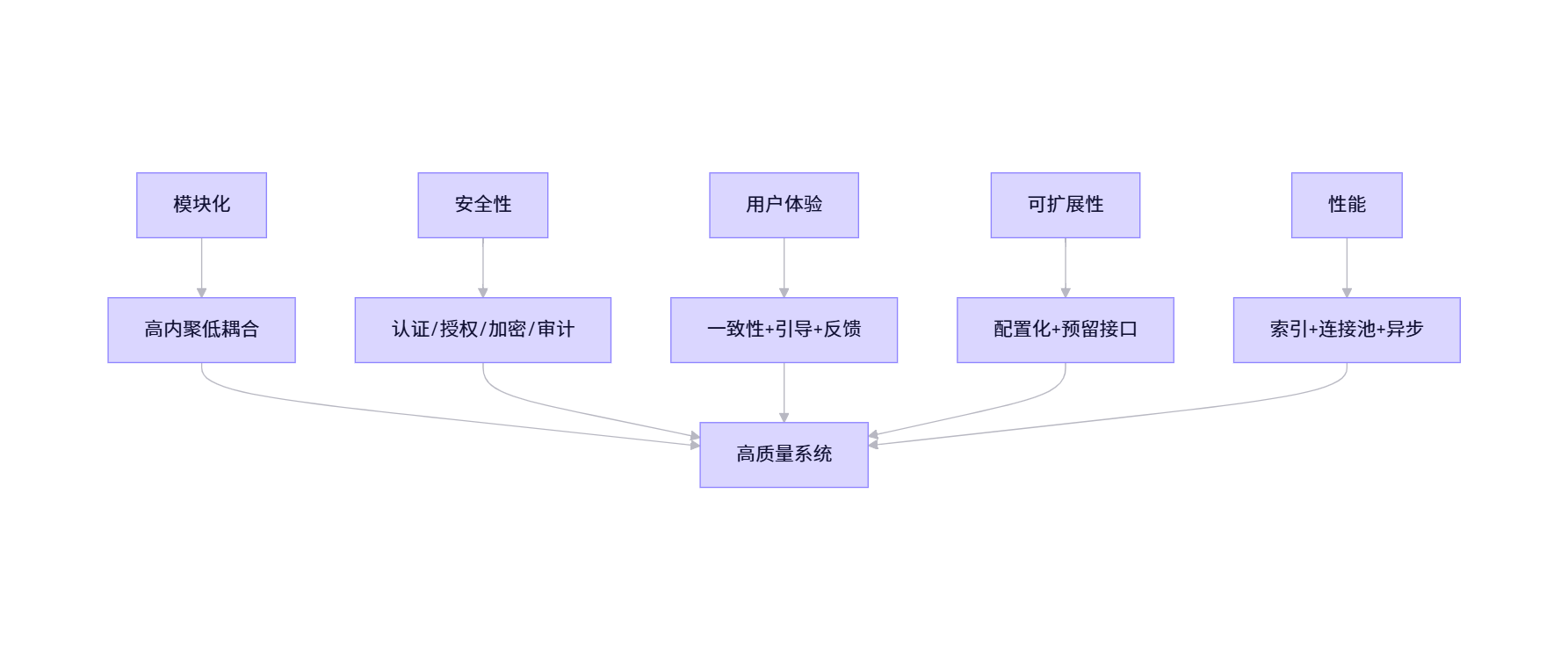 系统设计并非功能堆砌,而是要在满足需求的前提下,追求架构的优雅、代码的可维护性与用户体验的一致性。为此,本系统确立了以下五大总体设计原则: