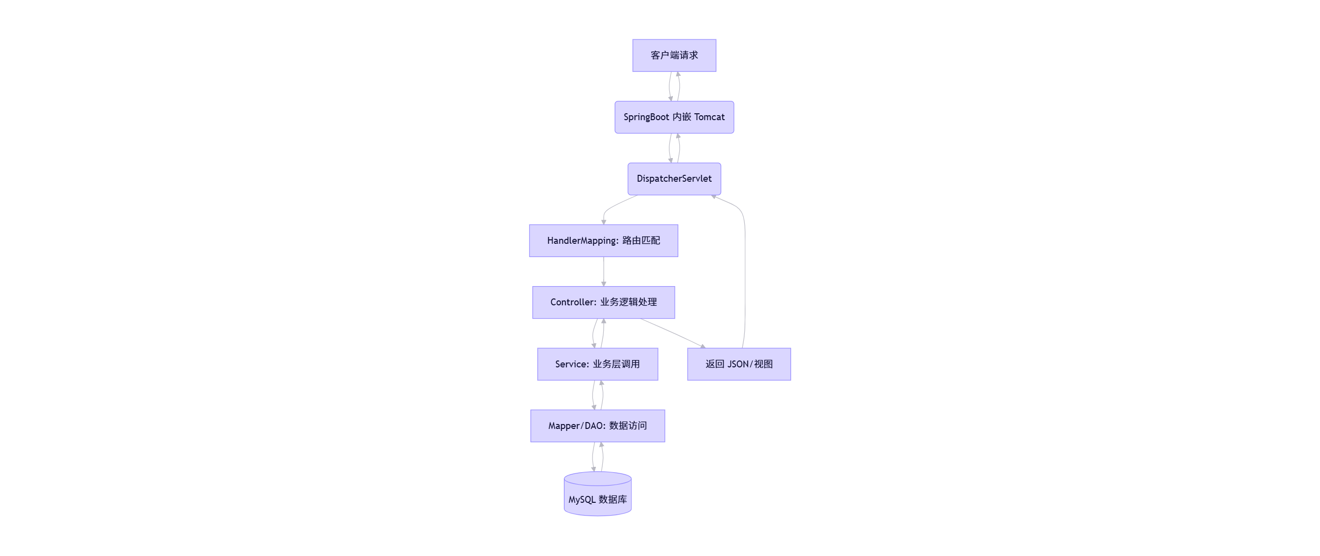 本系统所采用的技术栈均为当前业界主流且高度成熟的解决方案。后端以 SpringBoot 3.x 为核心框架,其自动配置、内嵌服务器、Starter 依赖管理等特性极大简化了企业级应用的搭建过程;配合 MyBatis 作为持久层框架,既能灵活编写原生 SQL 以应对复杂查询(如多条件岗位筛选、简历匹配度计算),又能通过 XML 或注解实现对象关系映射(ORM),避免冗余的 JDBC 模板代码。数据库选用 MySQL 8.0,支持事务、外键约束、全文索引及 JSON 类型,完全满足结构化数据存储需求。