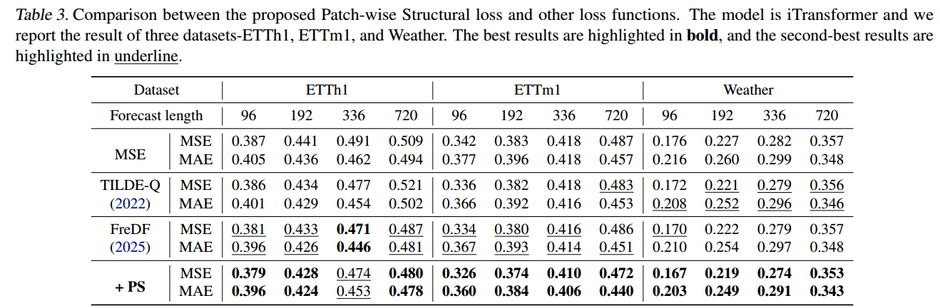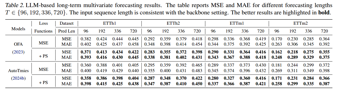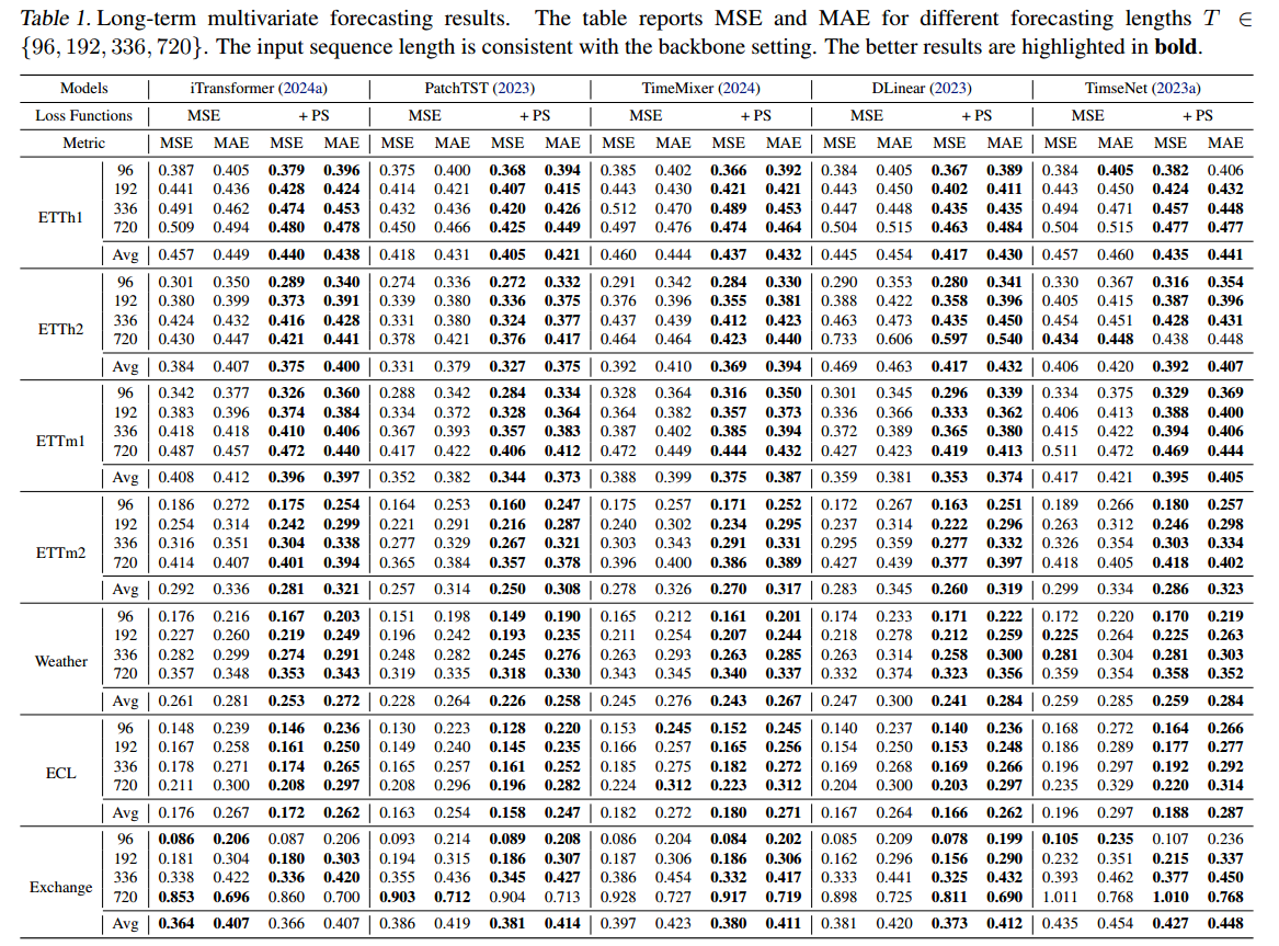 在大多数数据集和预测范围下,PS Loss 实现了最低的 MSE 和 MAE。