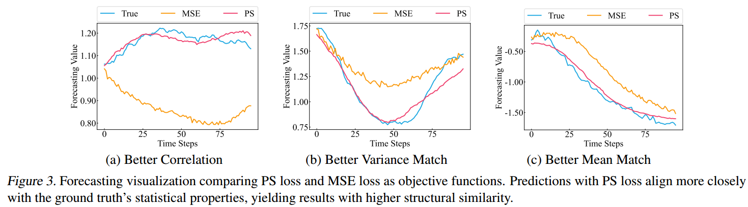 观察结果: 使用 iTransformer 在 Weather 数据集上进行的可视化(如图 3)显示,与 MSE Loss 相比,PS Loss 显著改善了与真实值的对齐:
