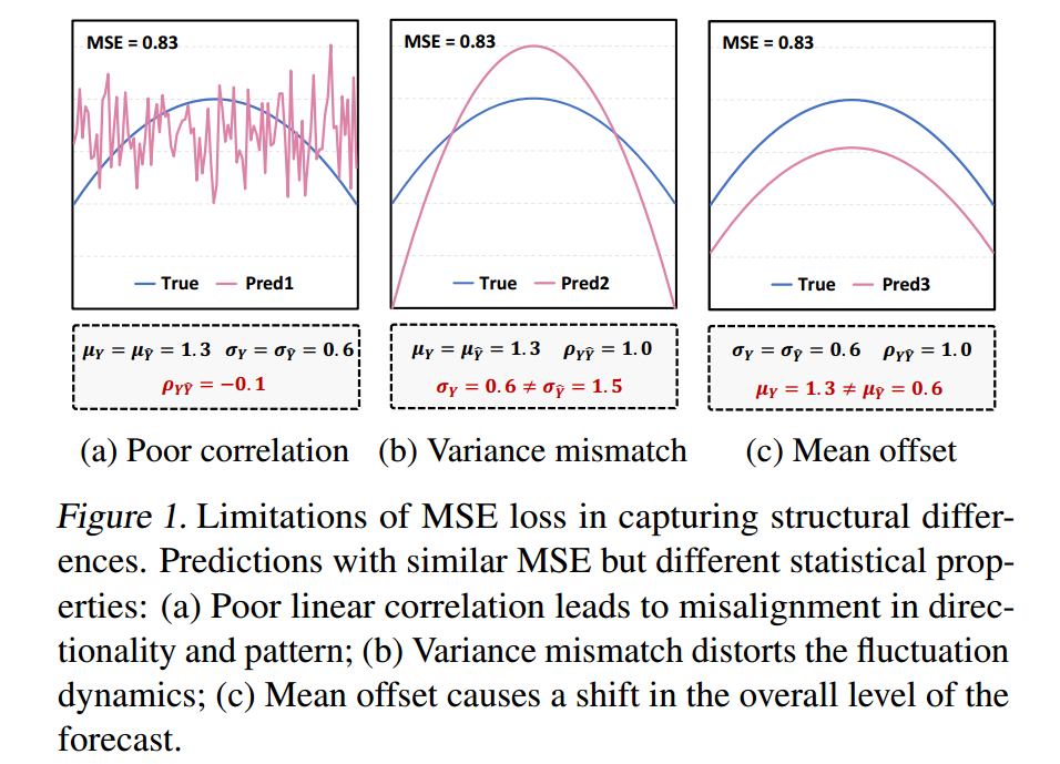 大多数现有的时间序列预测模型 严重依赖于点对点(point-wise)的损失函数 ,例如均方误差(Mean Squared Error, MSE) 。这类损失函数将每一个时间步独立对待,因此忽略了时间序列数据中固有的结构依赖性(structural dependencies) ,这使得模型难以准确捕捉复杂的时间模式。