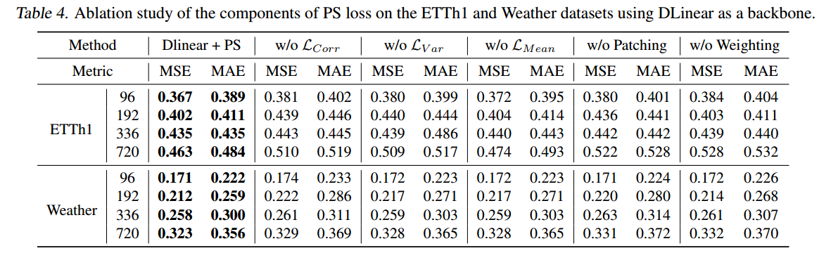 使用 DLinear 模型在 ETTh1 和 Weather 数据集上进行消融实验,评估 各个组件的贡献: