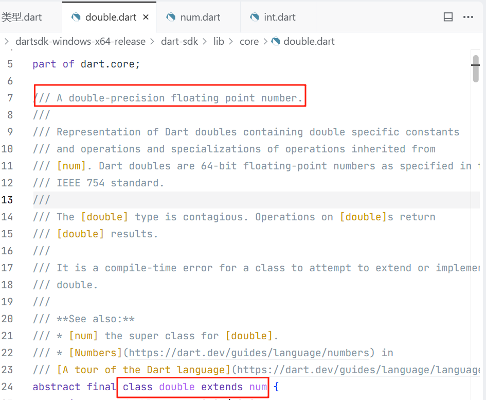 可以看到注释中描述,num是int和double的父类,且任何除int和double之外的类型继承或实现num,都会导致编译时错误。