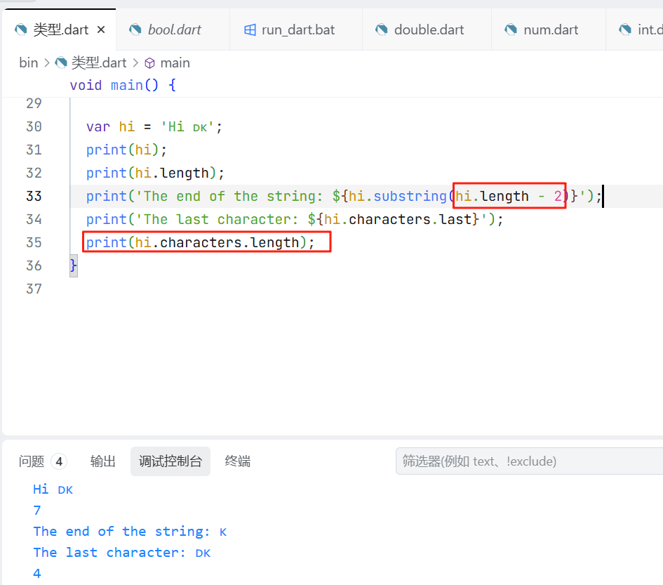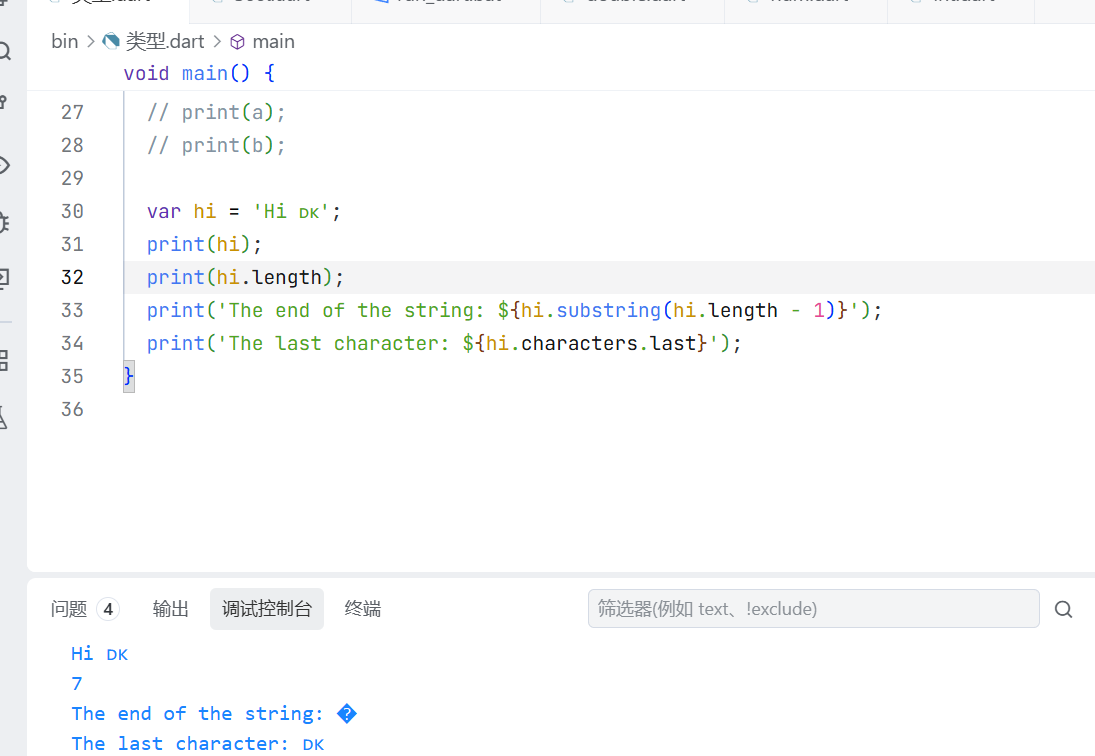 print('The end of the string: ${hi.substring(hi.length - 1)}');