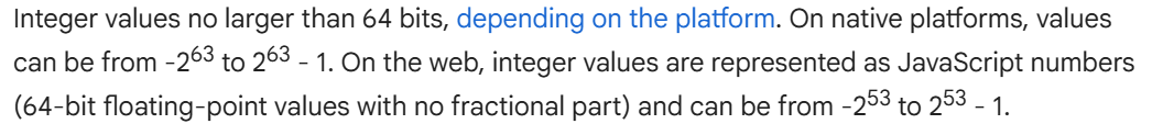 int的值不可大于64位,在navite平台是-263 to 263 - 1,在web上是-253 to 253 - 1,这一点需要注意,可能导致跨平台的bug。
