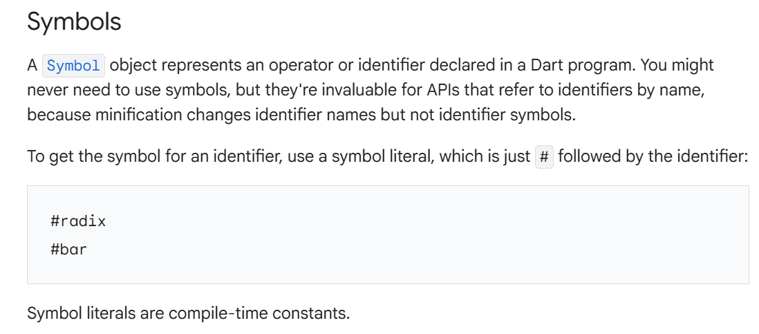 "Symbol 在 Dart 中被定义为一个 '被镜像(反射)、动态调用和 Function.apply 所使用的不透明名称'。