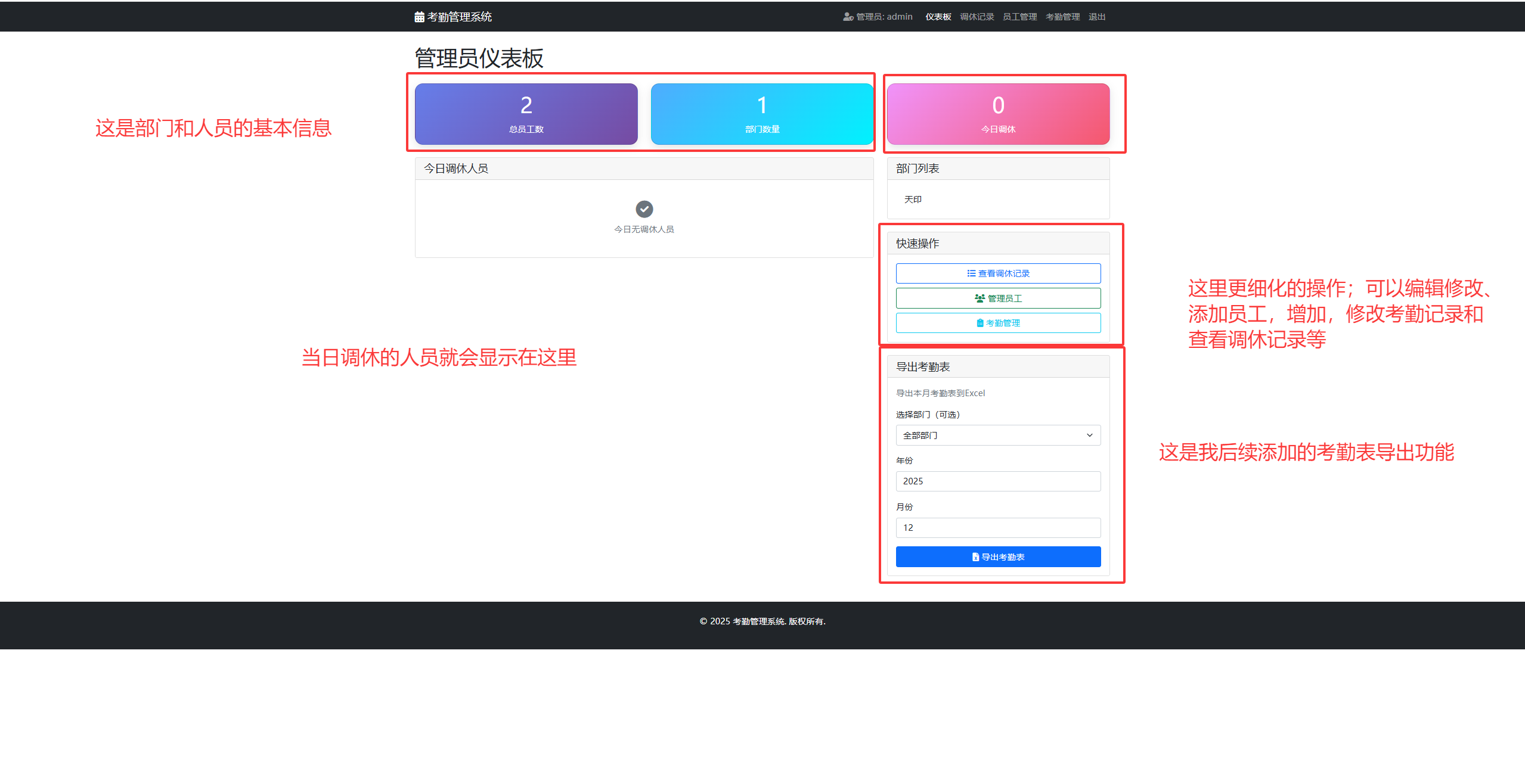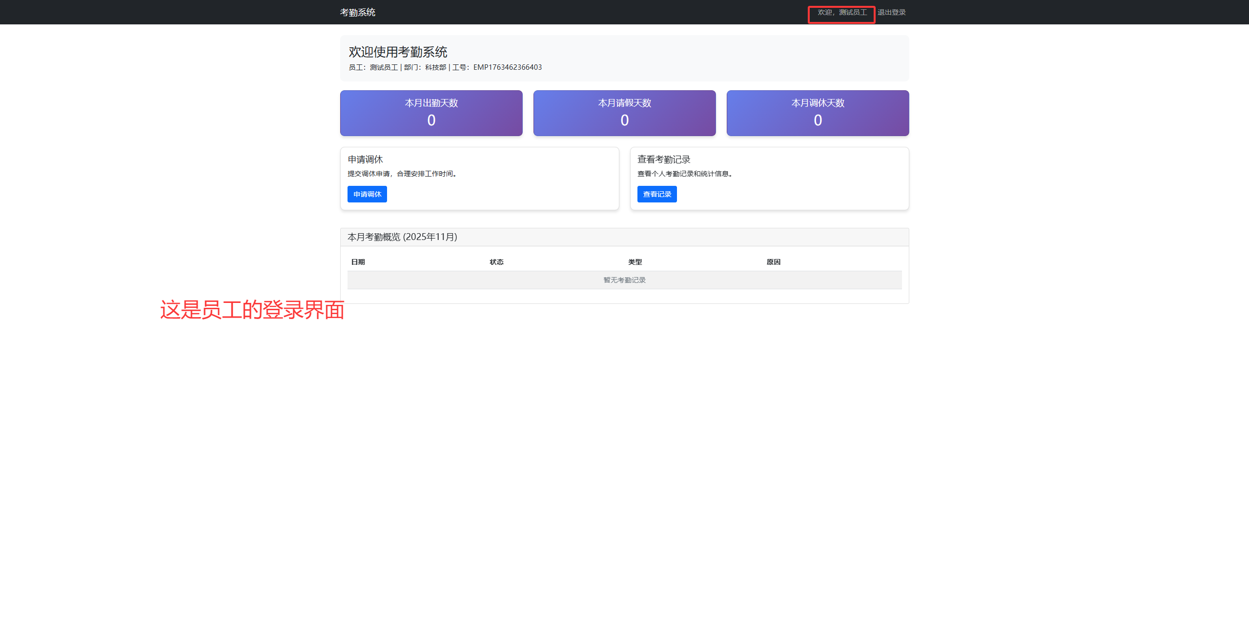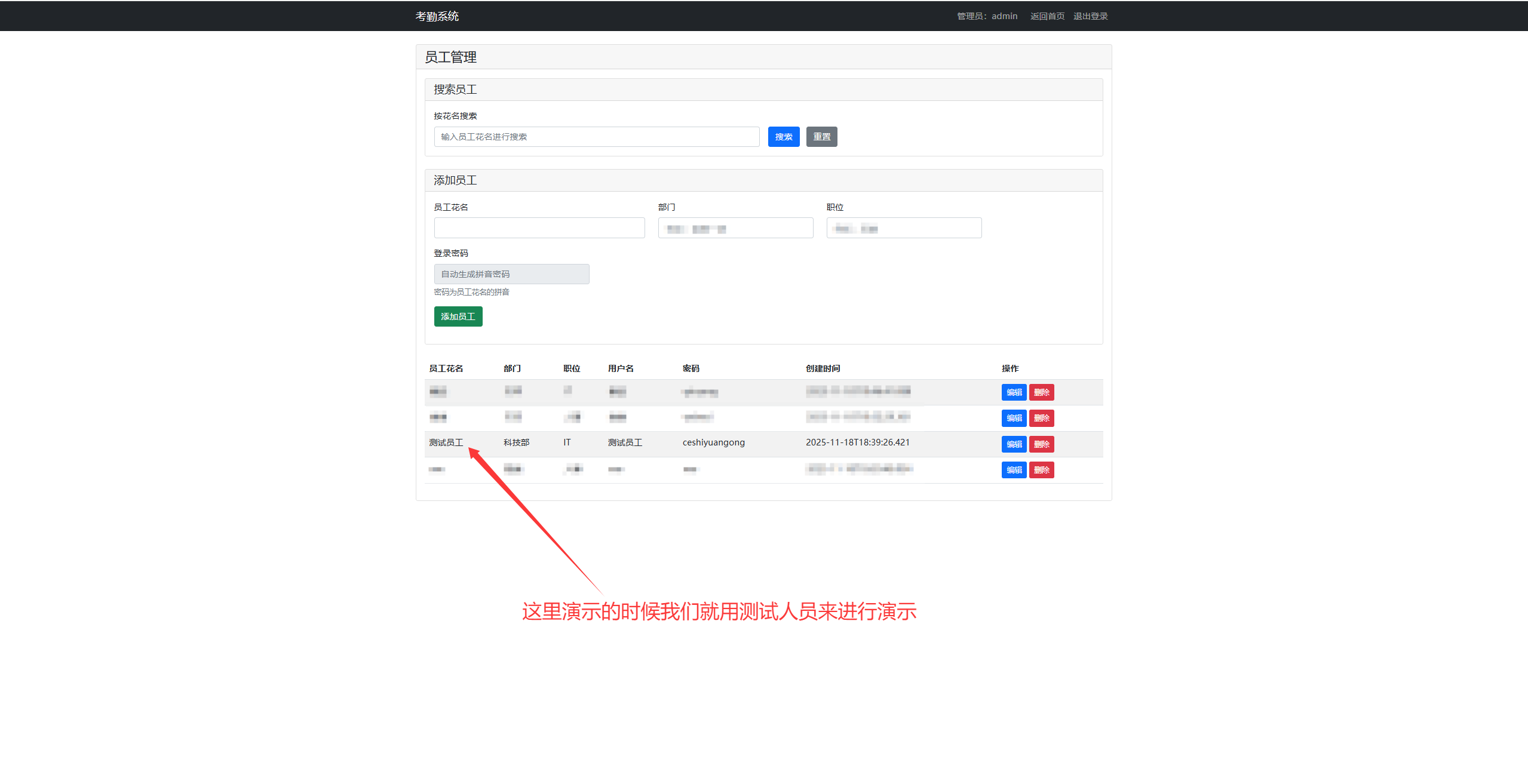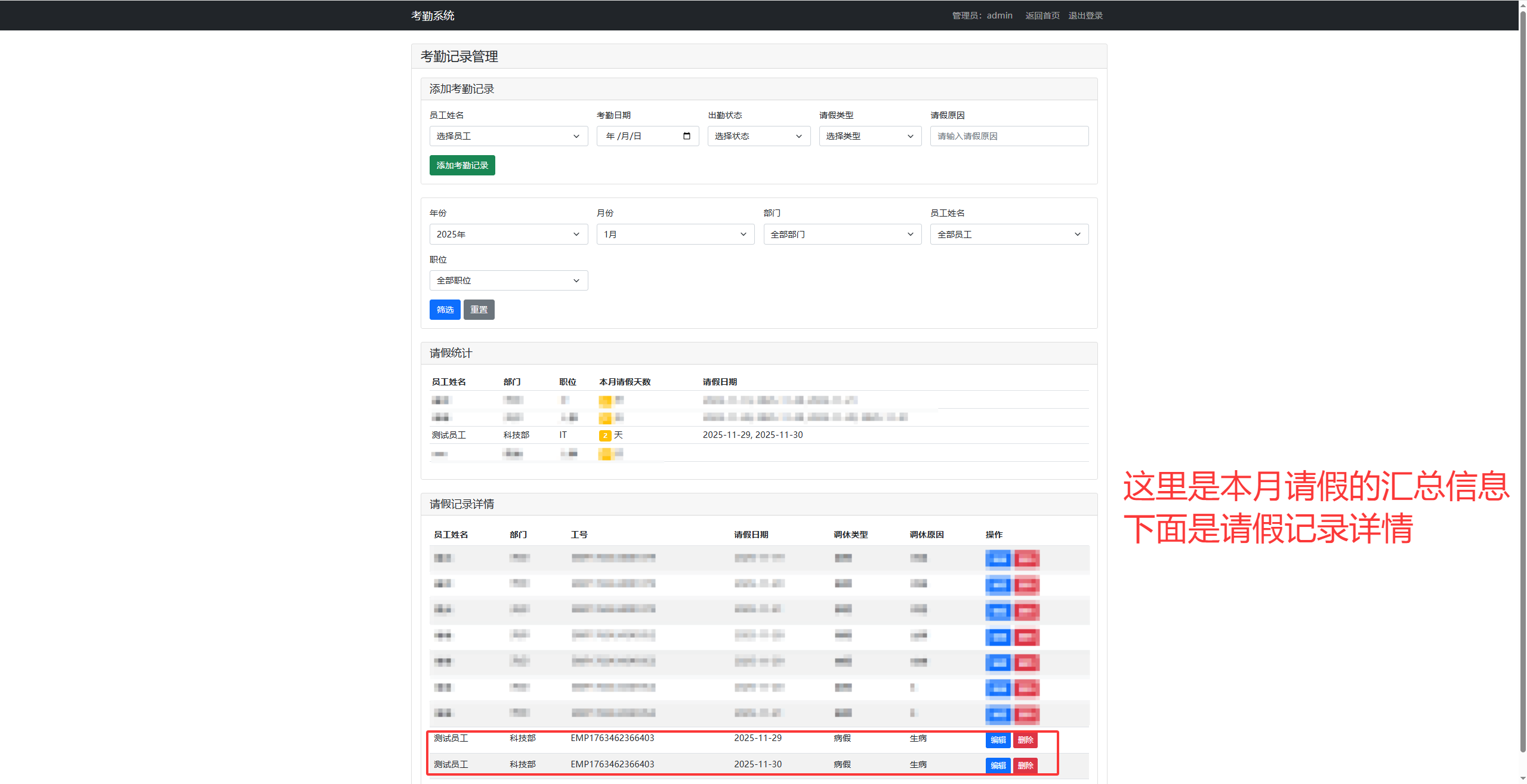 大致就是这个样子,不同的细化功能可以在后续完善。而且这个是超级管理员的界面。超级管理员admin有修改,添加员工、修改,添加员工记录等操作,方便统计和管理;