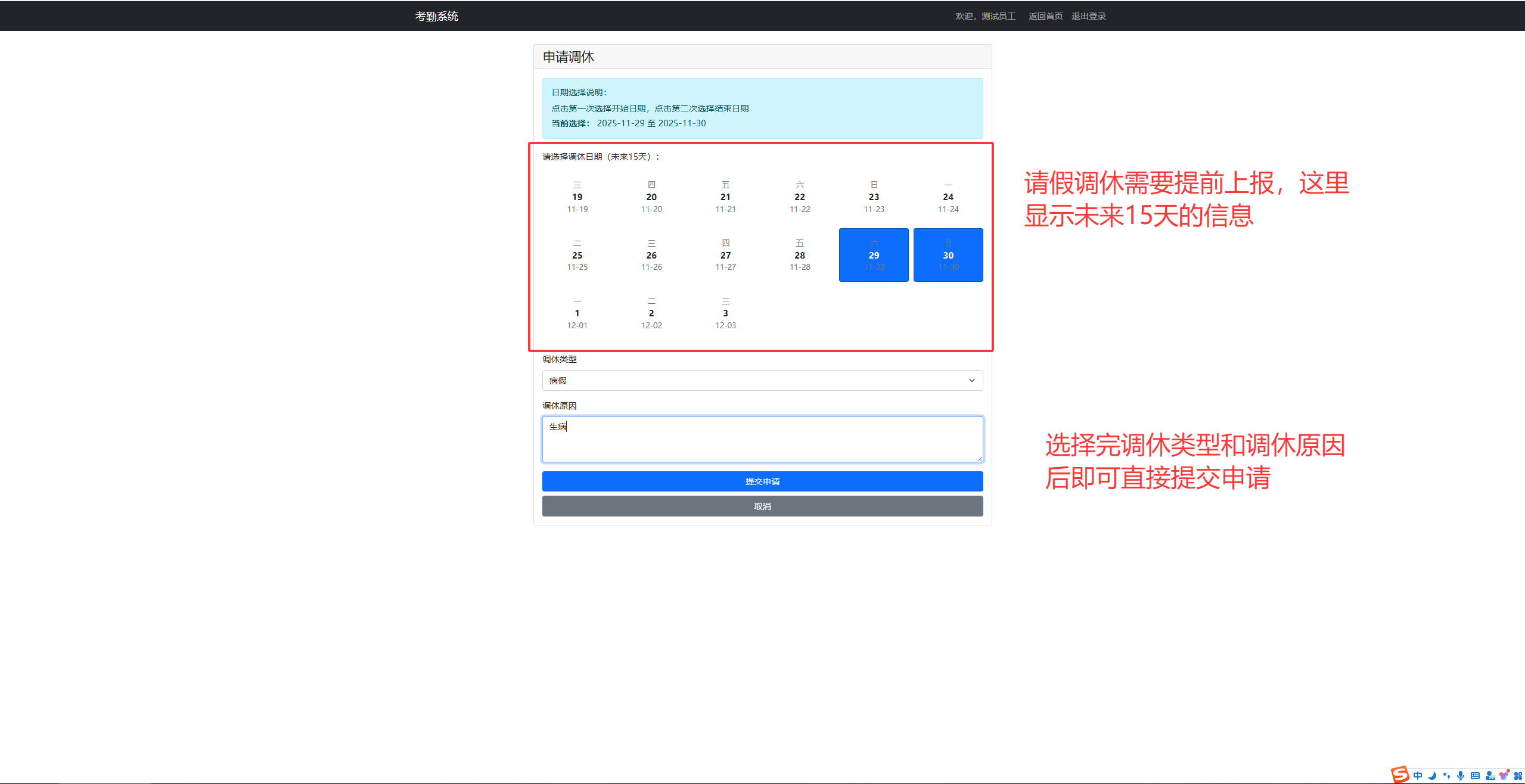 如果是员工要申请调休的界面则如下图这样:(前提是在管理员工页面内有这个员工)