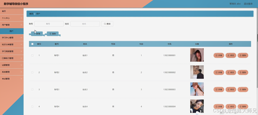 用户管理,在用户管理页面可以对索引、账号、姓名、性别、年龄、手机、头像等内容进行详情、修改或删除等操作,如图5-9所示。